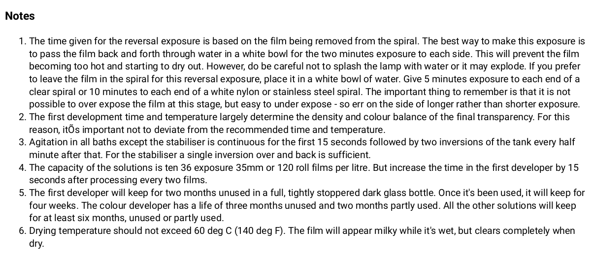 Ja przetestowałem coś bardzo podobnego ale na gotowej chemii. Jako FD poszedł FD z mojego zestawu do cz-b odwrotek (W14 Fenal z dodatkiem Rodanku potasu) oczywiście niskotemperaturowo, czas przyjąłem jak dla cz-b odwrotek trochę go skracając. Dalej przerwanie i 2x płukanie w zwykłej wodzie, zaświetlanie na szpuli koreksu (białej) w garnku z jasnym wnętrzem wypełnionym wodą 2x po 3minuty (następnym razem wydłużę do 2x 10 jak w podanym przez Ciebie przepisie). Reszta chemii to zestaw do ECN-2 z allegro.