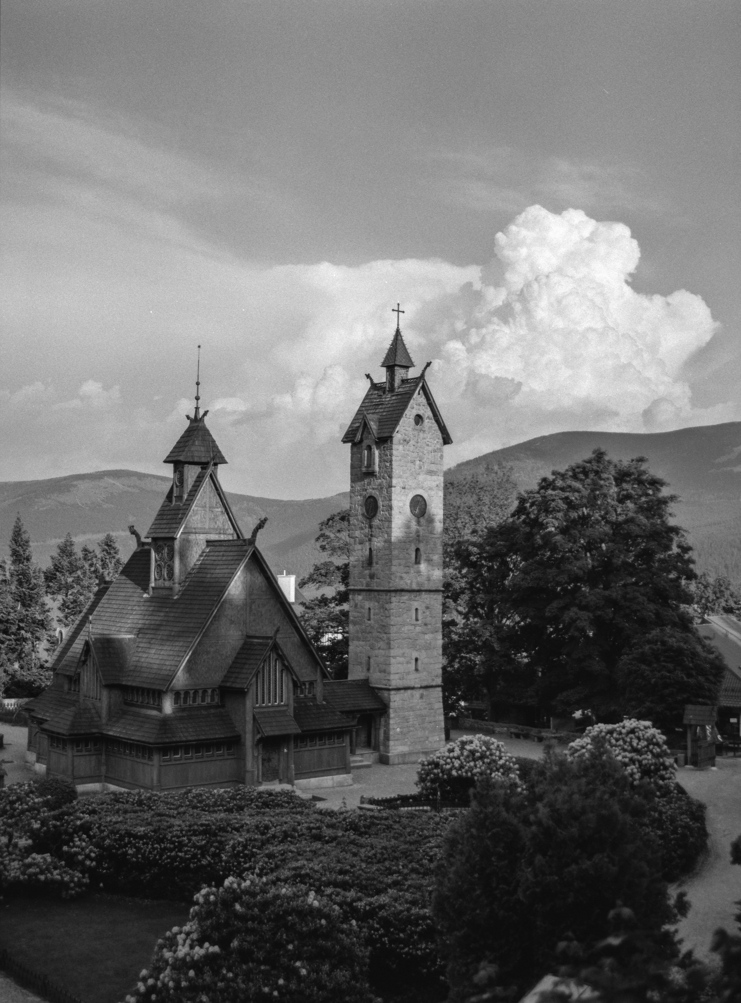 Wspomnieniowo. Kościół Wang w Karpaczu. Czerwiec 2018. Film Ilford FP4+, wołane w HC-110 1:31. Skanowane Epsonem V600. Pogodę mieliśmy piękną. Aparat Pentax 645N + zoom 45-85/4. Ogniskowa ok. 80mm