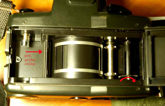 Tak, chodziło mi o tę plastikową rolkę z prawej strony, ona powinna lekko naciągać początek filmu podany przez metalowa rolkę zębatą.