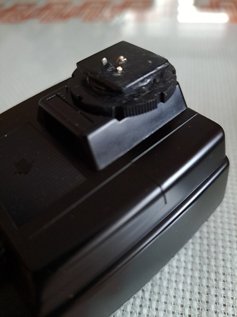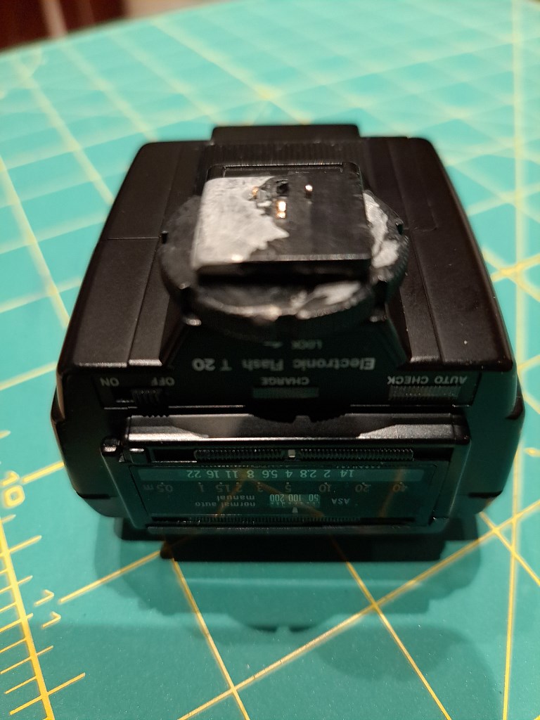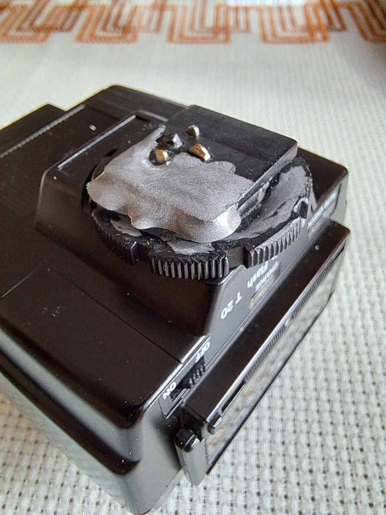 Chcę naprawić wyłamaną, plastikową stopkę lampy błyskowej - wcześniej ją wymontowując (lampa T20 Olympusa).