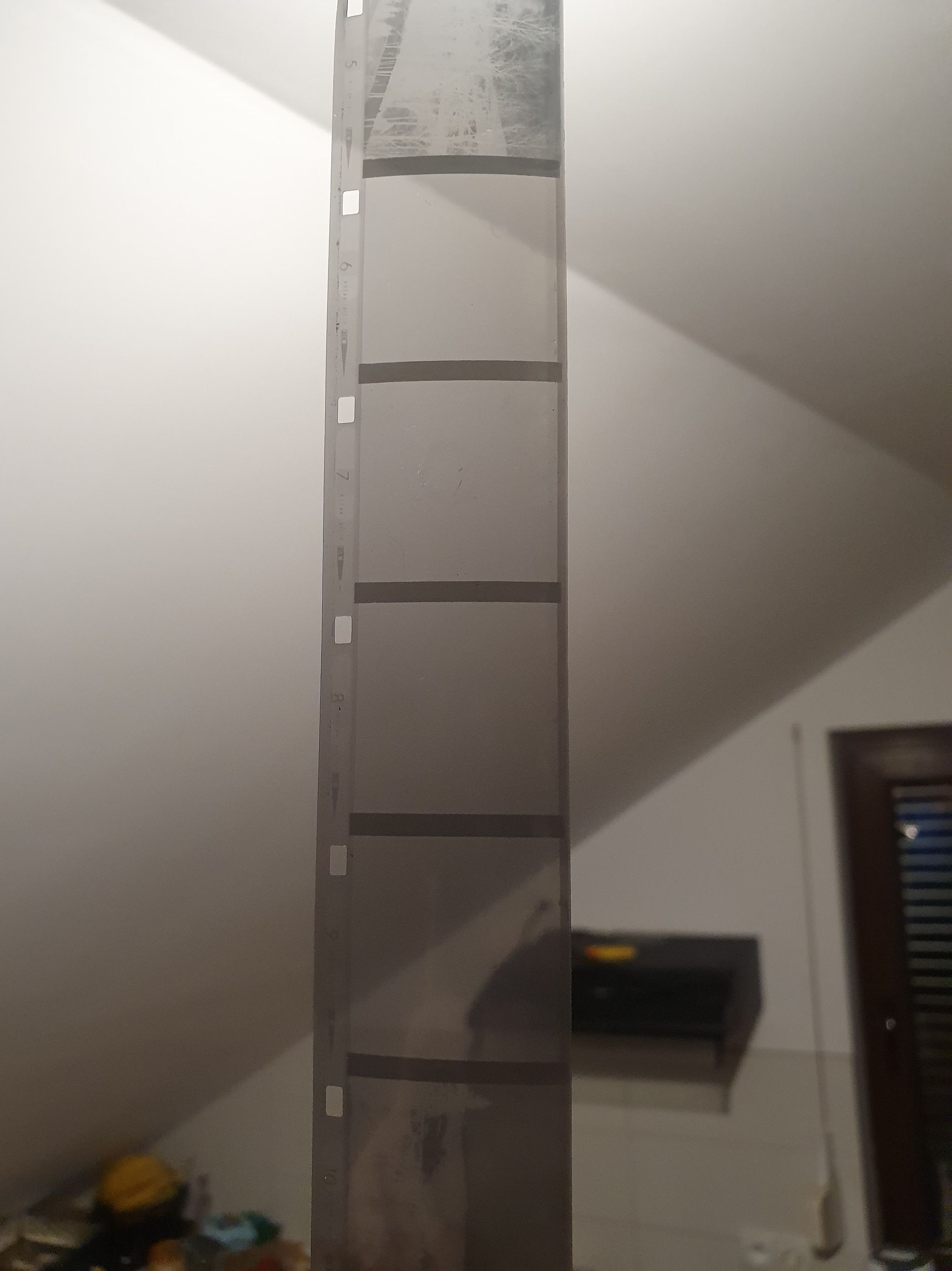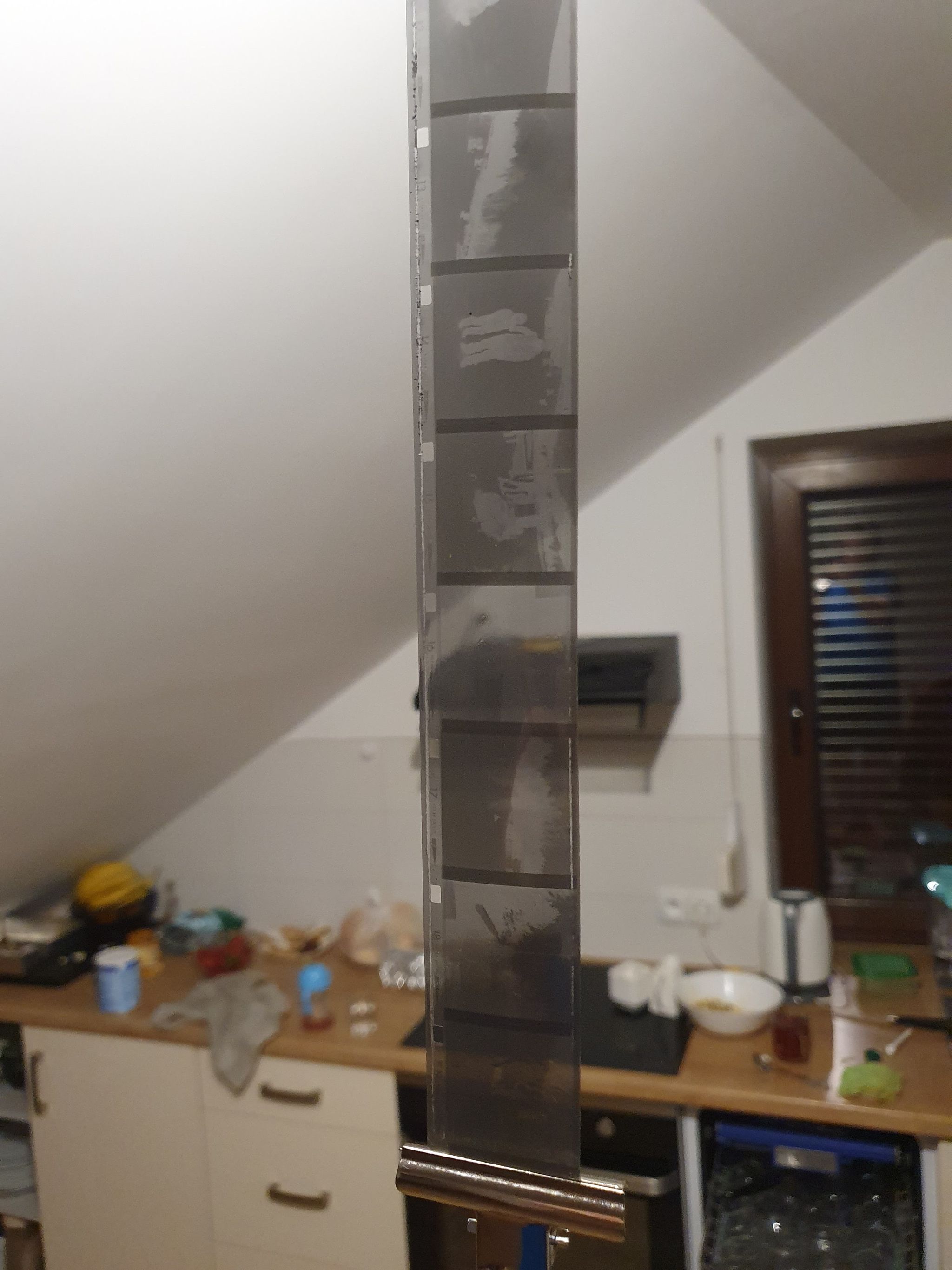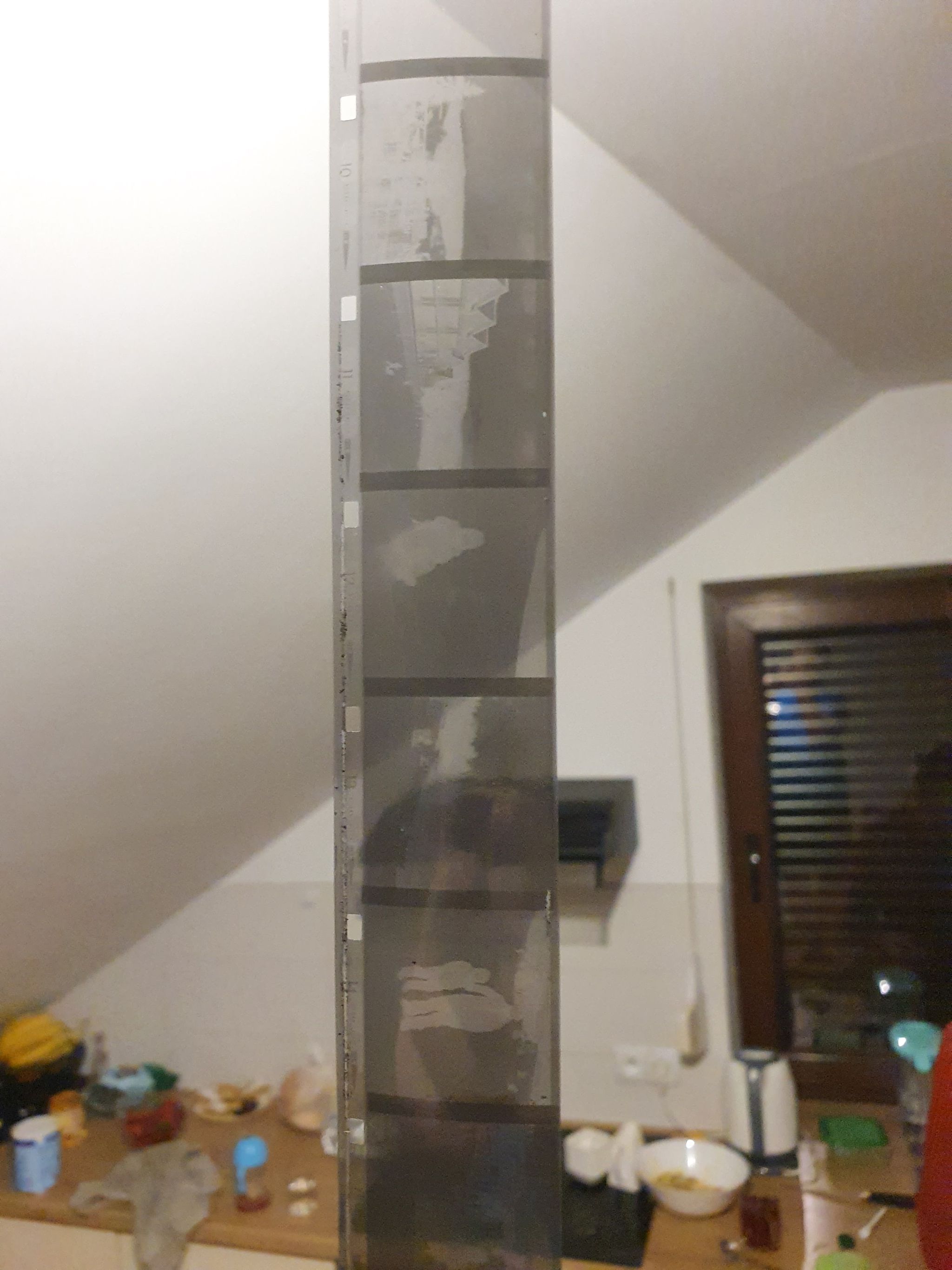 No więc tak. Jeżeli ten papier nie odchodzi, to podejrzewam, że film kiedyś zawilgł i to się przykleiło. Można oderwać, najwyżej zostaną jakieś frędzle, trudno. Ale jak mu się nic takiego nie przytrafiło, to faktycznie one nie są pewnie połączone, tak, jak 110, 120 i 127. Teraz. Jak to naświetlałeś takim prostym Instamaticem, to nie spodziewałbym się wiele, bo tam przecież nie miało prawa być żadnej korekty na utratę czułości, a po 50 latach to ona spadła przynajmniej tak 2^5, czyli koło 30 razy. Najstarsze, co ja wywoływałem, to było SL ORWO NP27 na 1978 chyba. Naświetlałem już nie pamiętam, na kilkanaście DIN jakieś, i wywołałem Fomadonem LQR w nominalnym czasie (na ile jestem w stanie dopasować z danych), bo tego używam do takich zabytków, żeby podbić kontrast (i to się nawet chyba sprawdza). Nic nie wyszło :-) W dwóch miejscach były jakieś cienie wskazujące na granice klatki, czyli dla tak starego filmu trzeba było zejść w okolice 10 DIN, albo i niżej.