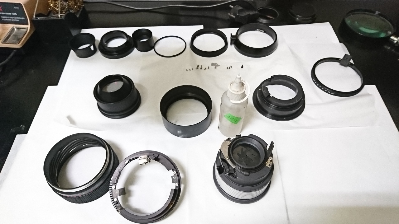 Rozbiórka tego obiektywu nie jest skomplikowana. Wszystko wyczyściłem benzyną ekstrakcyjną (mechanika) i izo (szkła) .