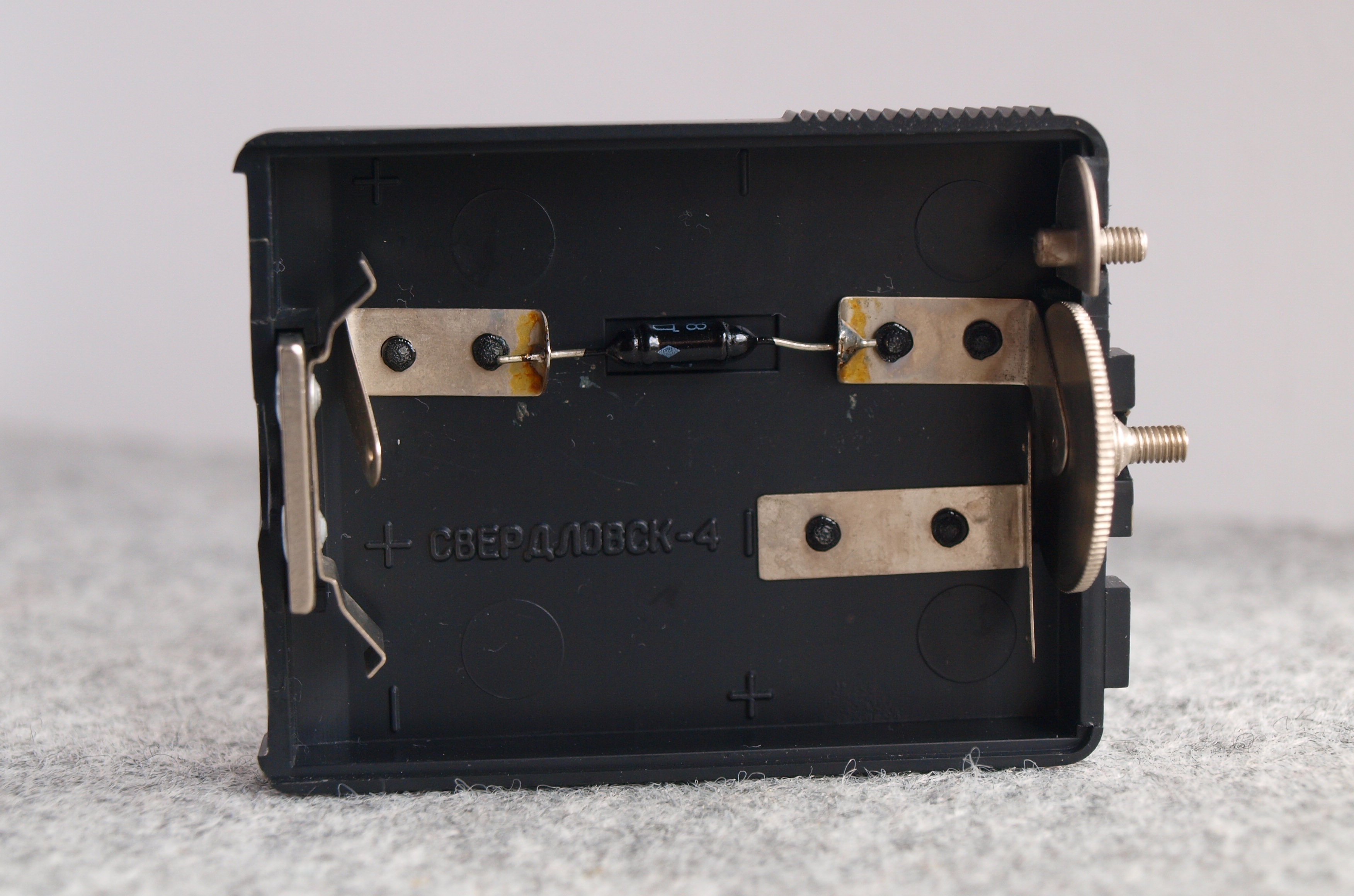 Do zasilania zgodnie z instrukcją producenta potrzebne jest napięcie od 3 do 4 woltów. Jako dodatkowe wyposażenie dodawano pudełeczko na trzy baterie AA, wewnątrz którego była wlutowana w szereg z nimi krzemowa dioda, dająca spadek napięcia ok. 0,7 wolta. Widać ją na zdjęciu. Swierdłowsk z tym pudełeczkiem jest trochę duży, więc wlutowałem taką diodę wewnątrz światłomierza i zasilam go z trzech guziczków SR44 włożonych w kawałek plastykowej rurki z podkładką dystansową, bo same baterie są za krótkie.