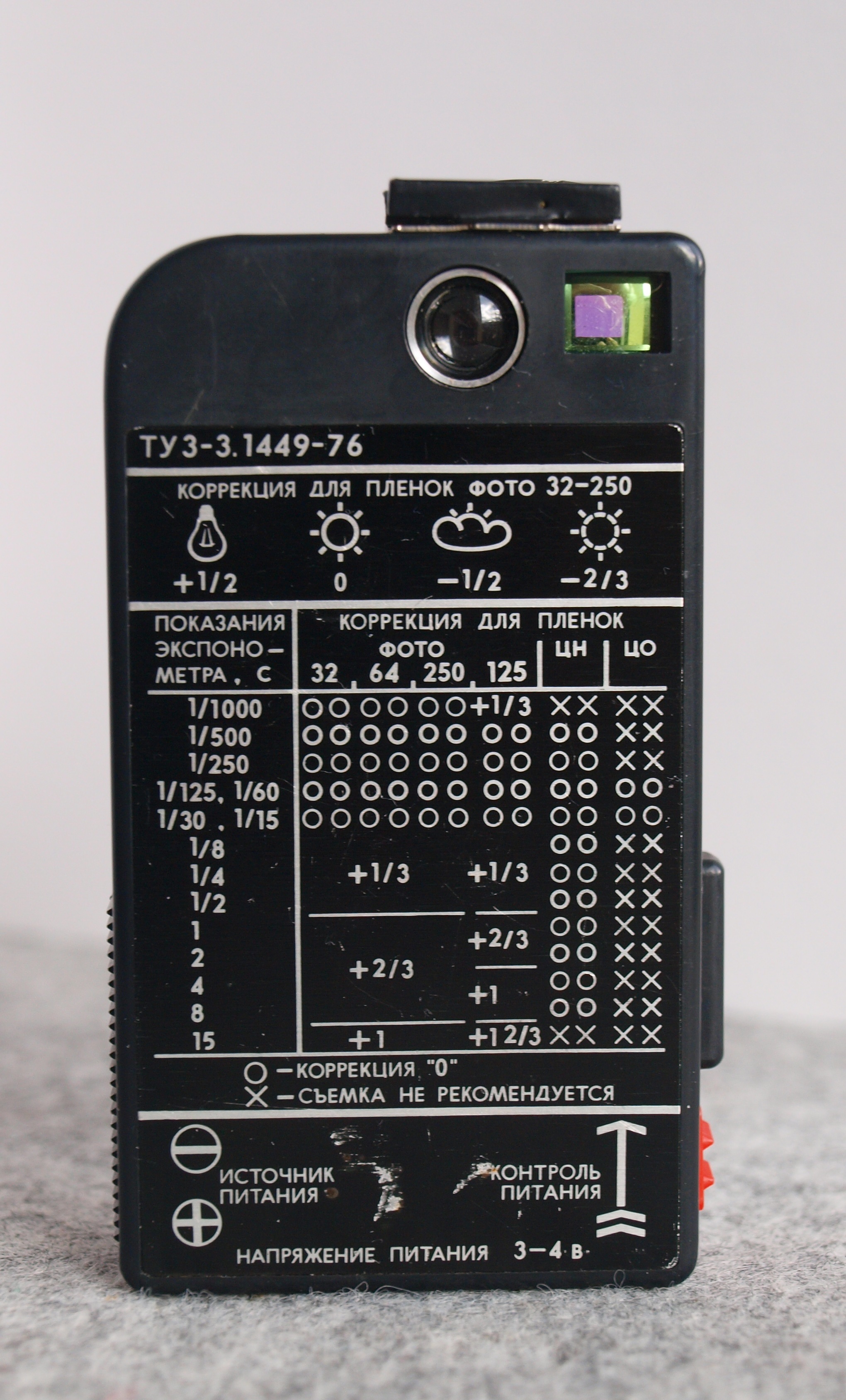 Po zastosowaniu takich samych wymiarowo baterii LR-9 o napięciu 1,5 V błąd sięgał nawet 2 EV, w dodatku zależał od oświetlenia - rósł z jego spadkiem.