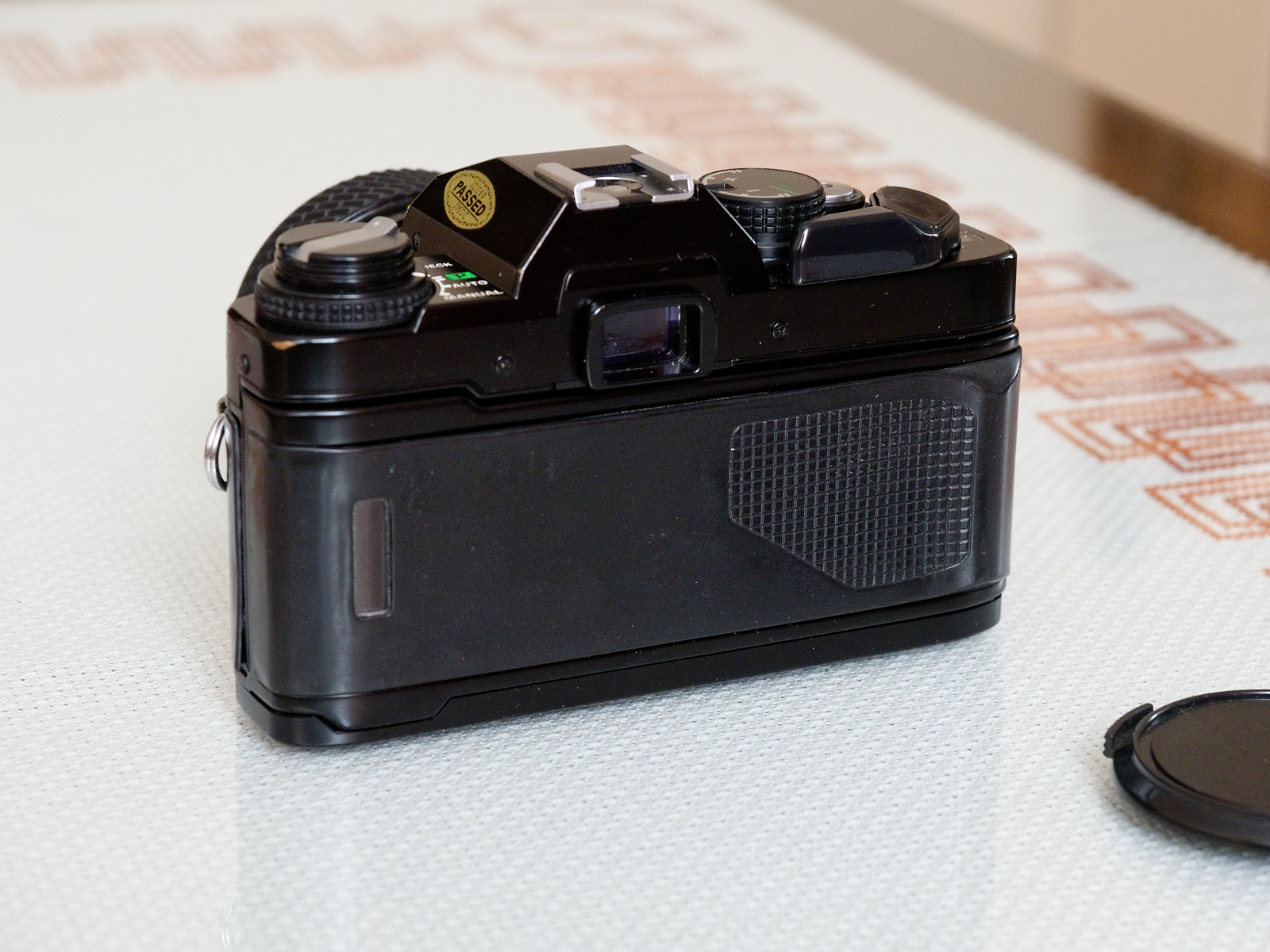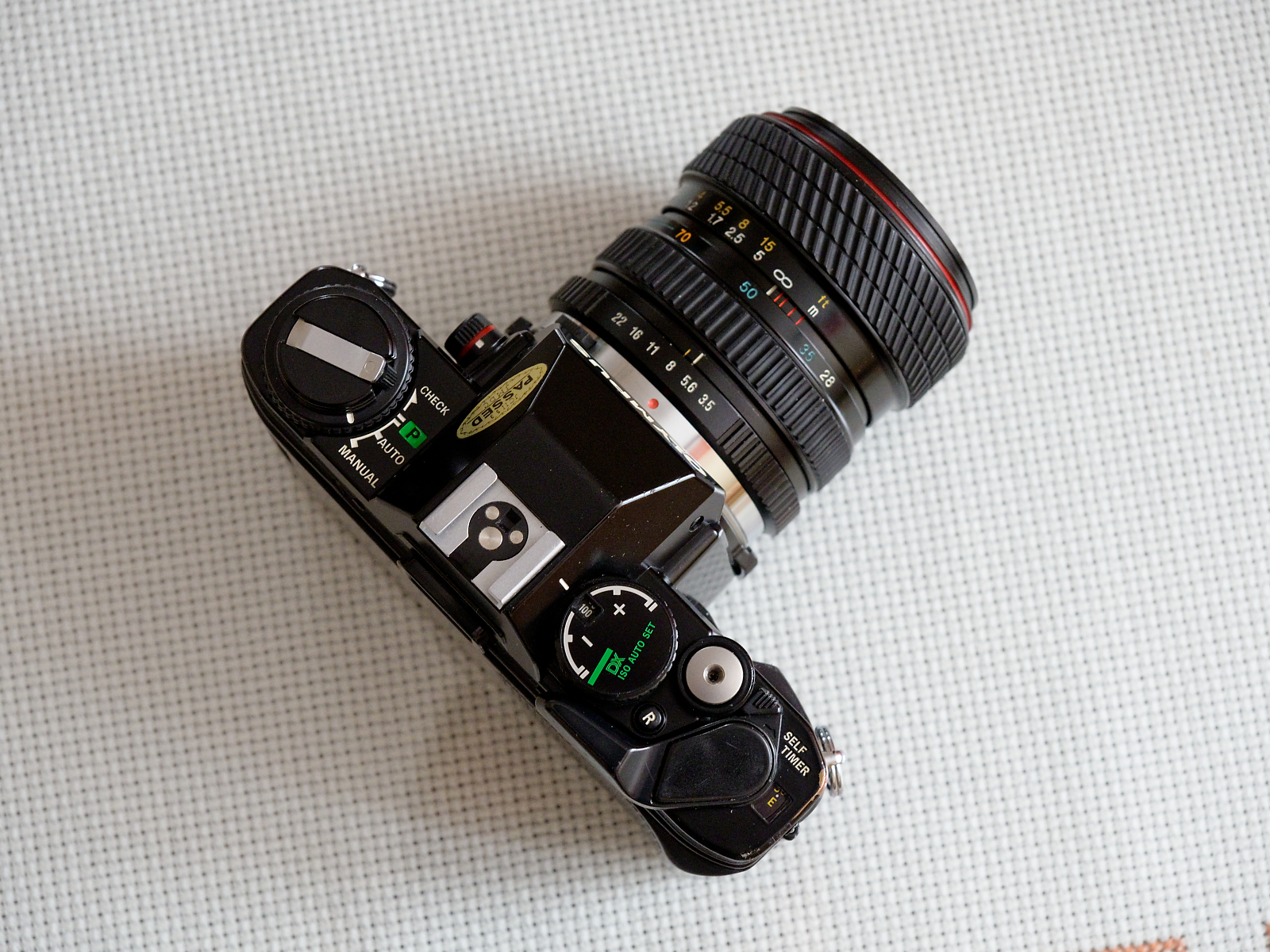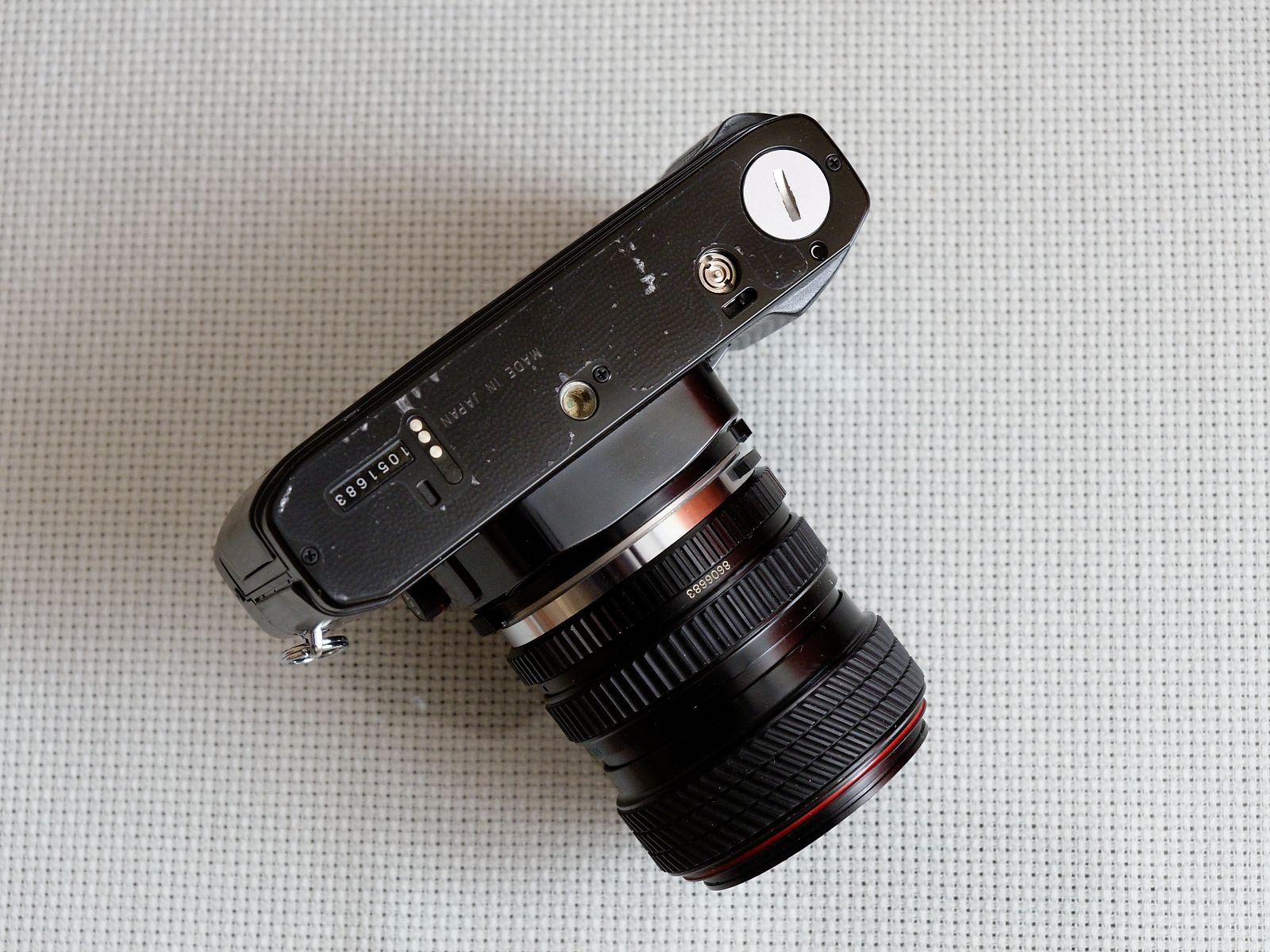 Aparat bez często spotykanego białego nalotu na okleinach, niewielkie przetarcia lakieru tylko na rantach korpusu obok mocowań paska. Widoczne na załączonych zdjęciach skazy na dole korpusu to uszkodzenia jedynie pokrywającej dolną pokrywę folii zabezpieczającej.