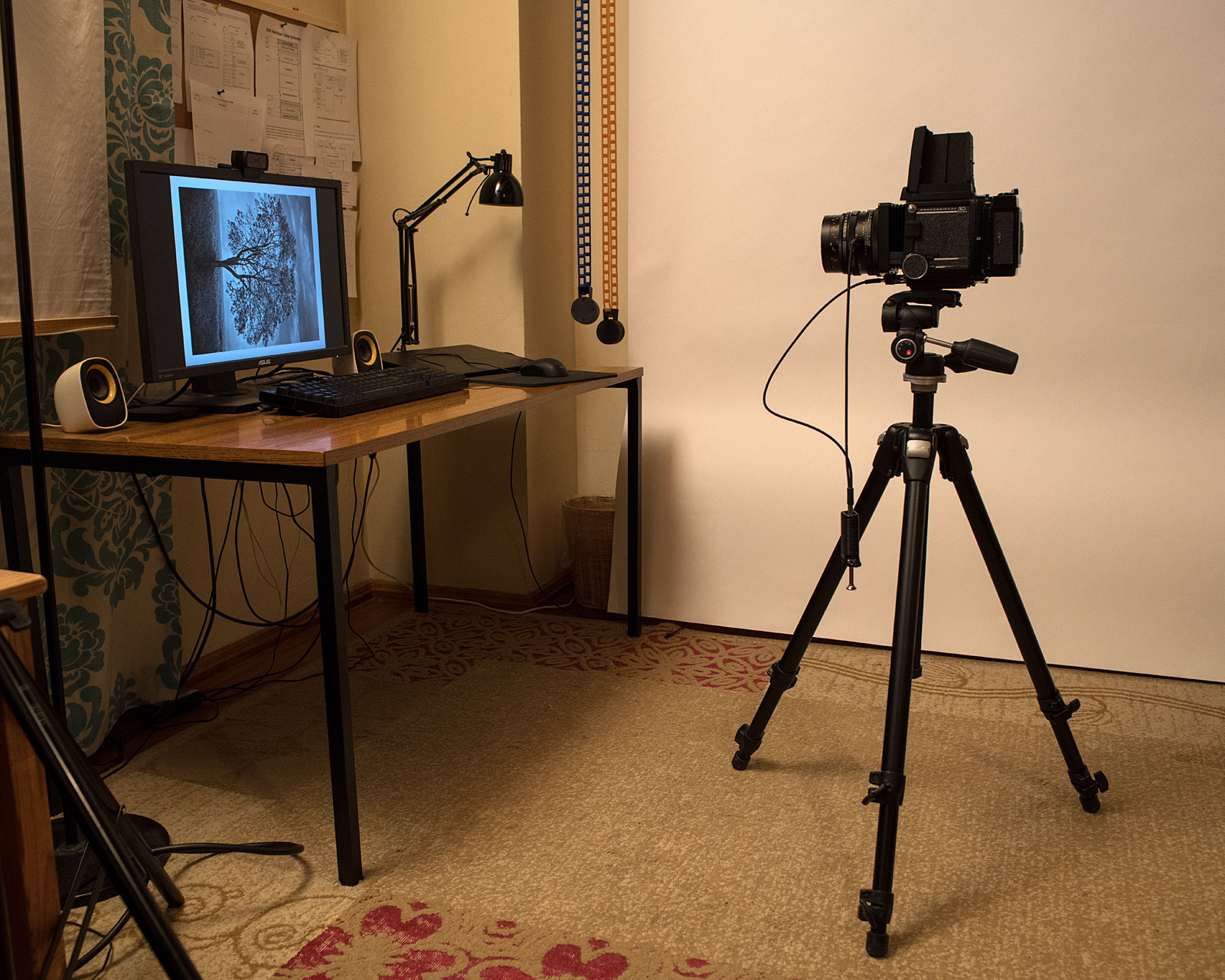 6) Ustawić na statywie aparat z negatywem na wprost monitora, najlepiej żeby monitor wypełniał matówkę. Przymknąć przysłonę, najlepiej o conajmniej 2 działki od pełnego otworu.