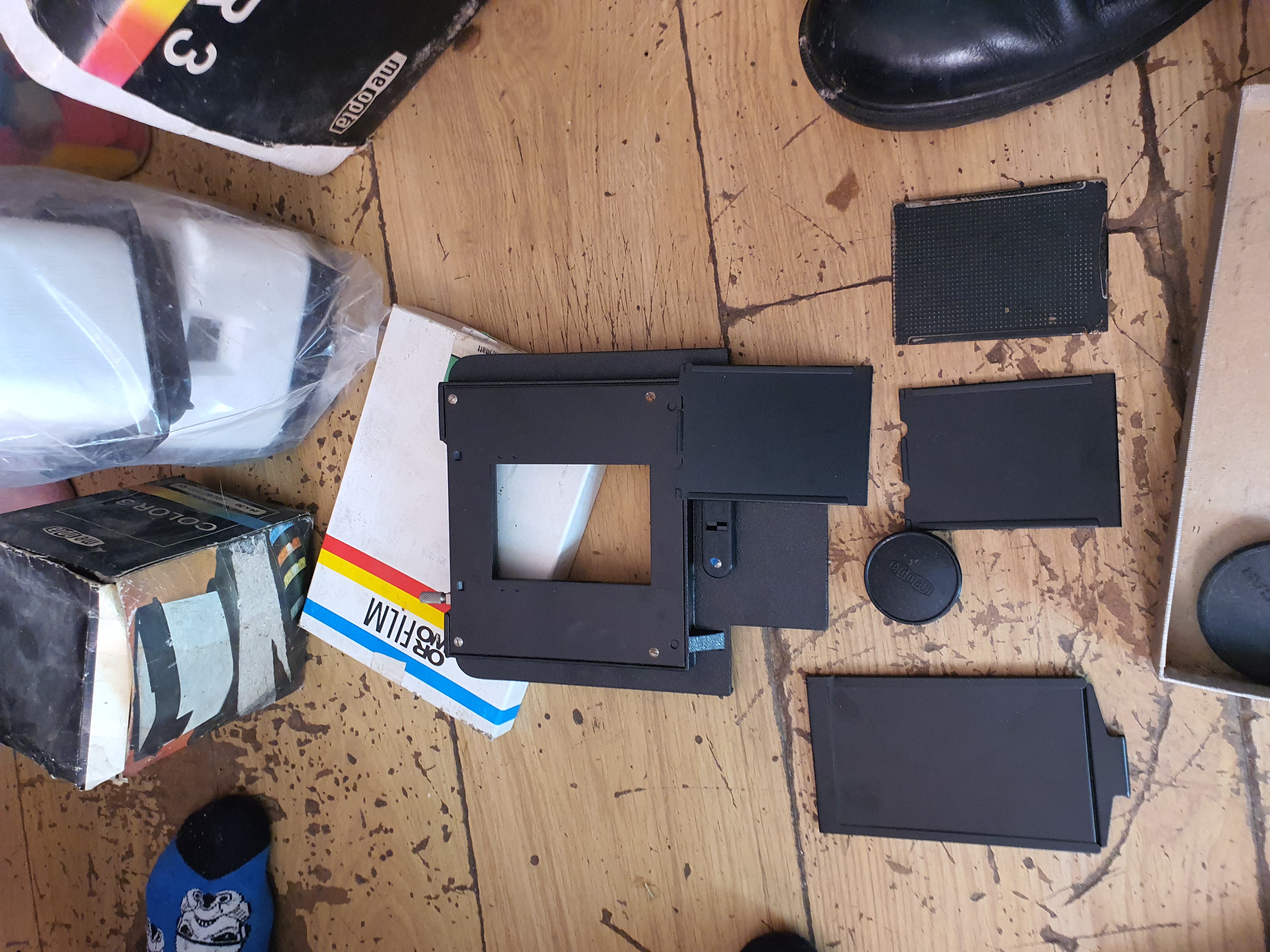 Na zdjęciu nr 3 kasety na błonę ciętą - tą z białego pudełka, zaślepki z obiektywu powiększalnikowego i chyba Praktiki serii B oraz kaseta reprograficzna z Maginfaxa. Te sprzęty solo są coś warte, ale komplet dużo więcej.