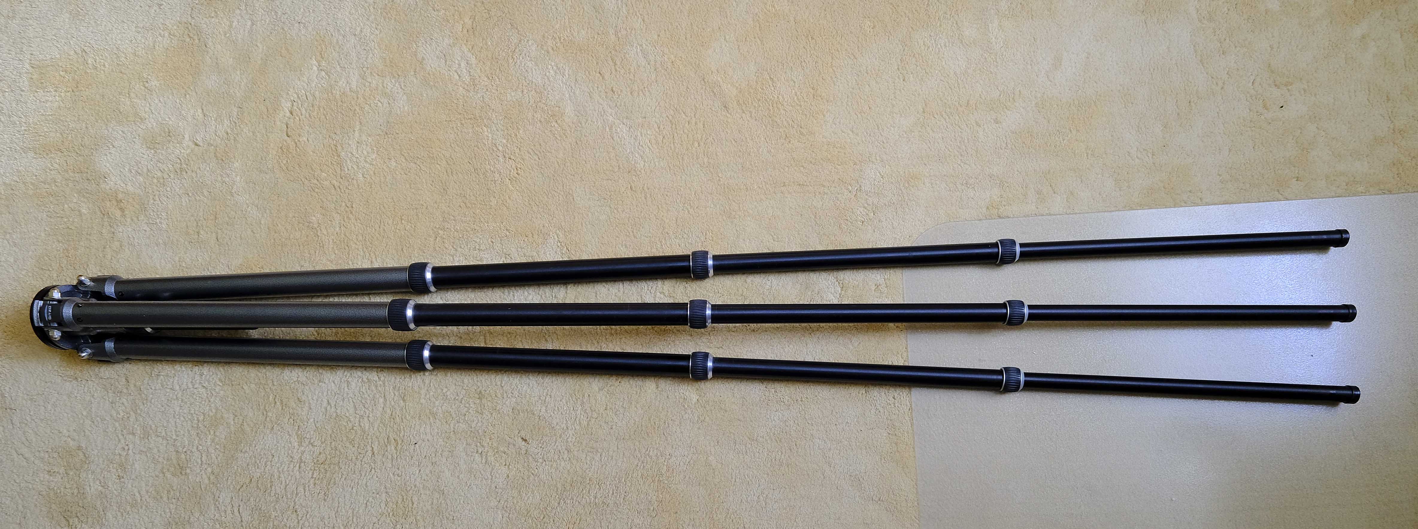 Profesjonalny statyw firmy Gitzo. Waga ok 3 kg, po rozłożeniu wysokość 161 cm, wyciągnięta kolumna centralna do góry dodaje 30 cm. Po złożeniu wysokość 57 cm. Statyw posada trzy sekcje oparte na poduszkach powietrznych. Regulacja blokad daje możliwość fotografowania z niskiego poziomu. Statyw aluminiowy. Stan praktycznie jak nowy, może użyty ze trzy , cztery razy. Przeleżał w szafie. Jedyna modyfikacja to nakrętka na śrubę wykonana z mosiądzu - nie do zdarcia. Preferowany odbiór osobisty. Polecam. Starczy na długie lata. Cena 2500 zł
