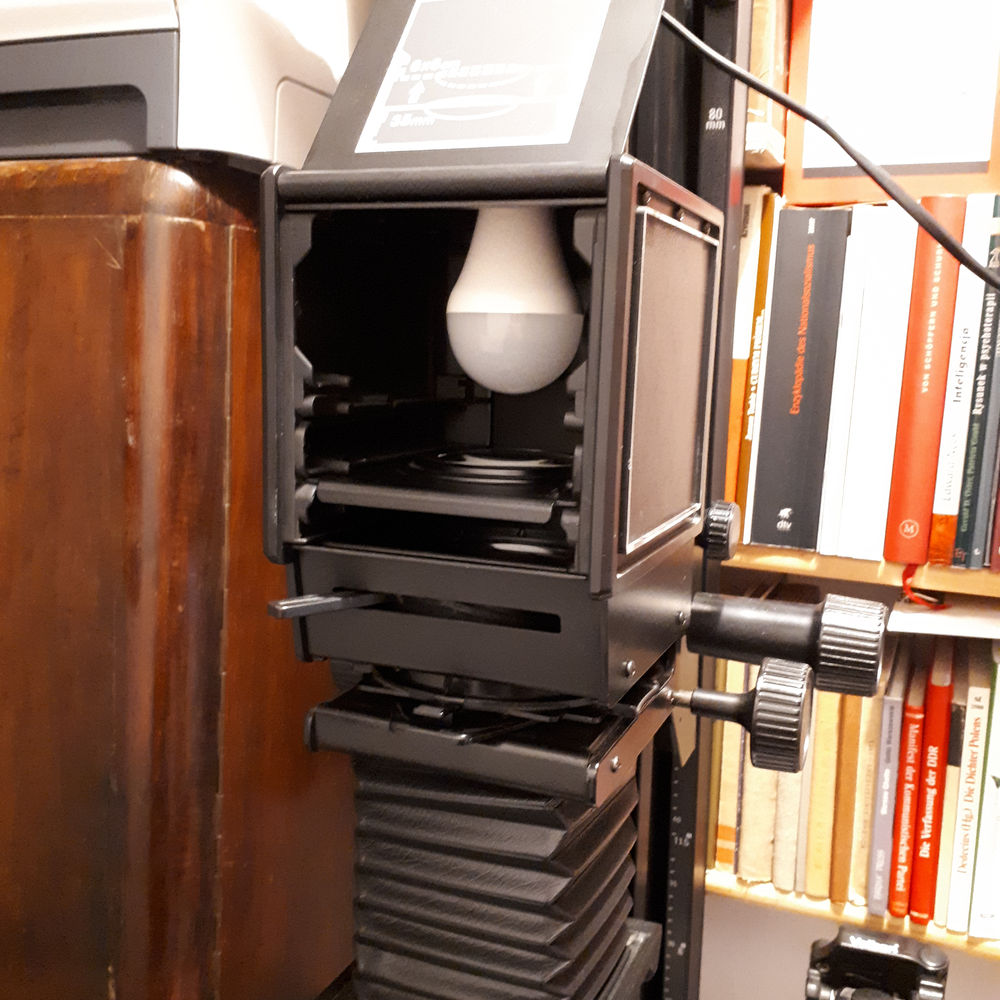 Tak się złożyło przypadkiem, że wszedłem w posiadanie takiego sprzętu niekompletnego, brakowało zasilacza, jednej soczewki kondensora i żarówki. Soczewkę kondensora udało się zdobyć na ebayu... chociaż dość drogo (z wysyłką ~190zł). Zasilacz 19V dopasowałem ze starego laptopa... jedynie kłopot jest z żarówkami, które ogólnie są już trudno dostępne. Postanowiłem że zamiast się męczyć odkręcę całe ustrojstwo z pryzmatem i filtrami kolorów (łatwo się demontuje) i zamontuję zwykłą żarówkę LED. Kupiłem oprawkę do lampy sufitowej i kabel z włącznikiem do lampki w sklepie budowlanym i w prosty sposób, bez żadnych trwałych przeróbek udało się to zamontować... i działa znakomicie.