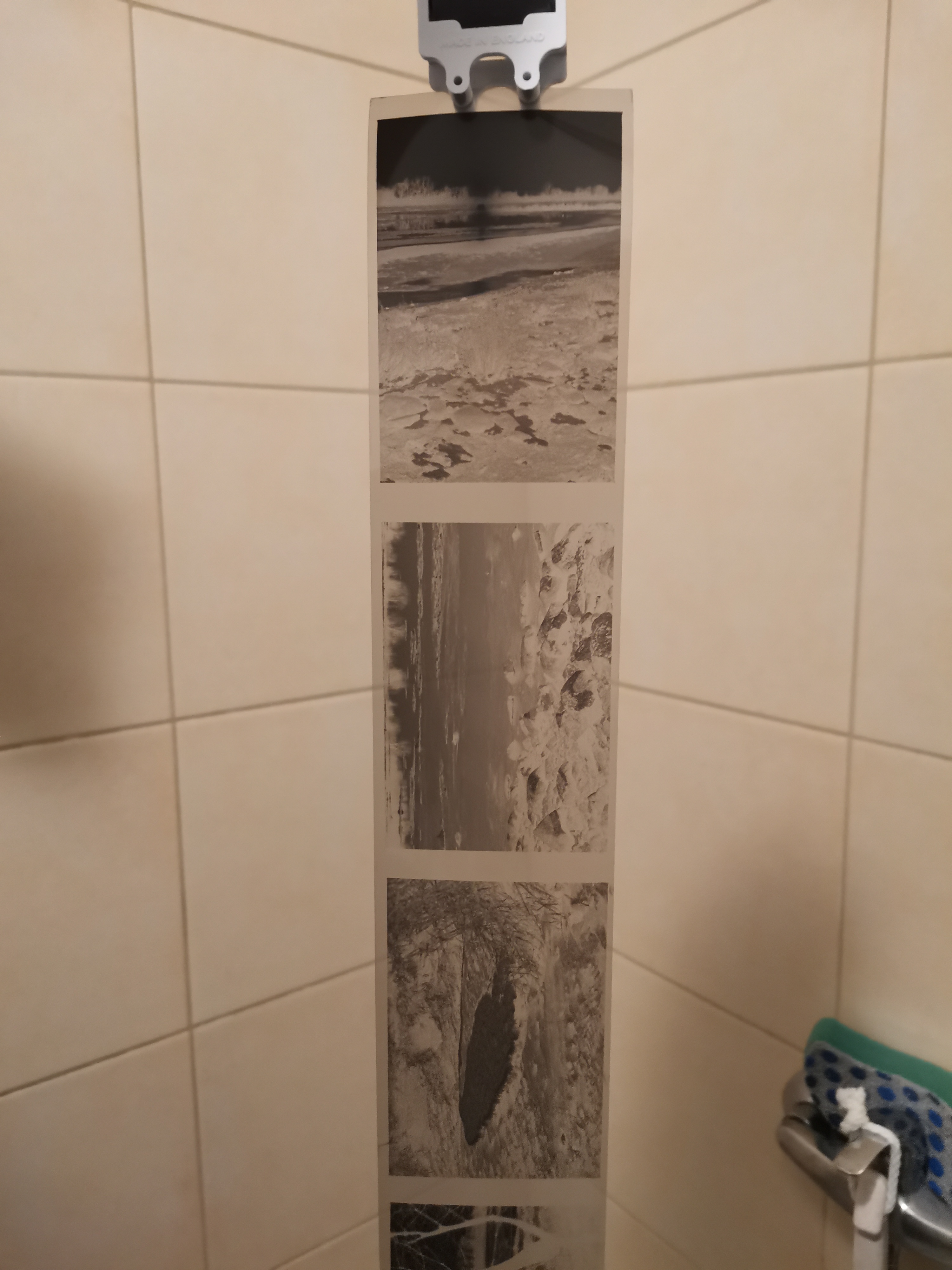 Co sądzicie o takim efekcie? Pojedynczy wąski pas względnie normalnego negatywu, przypadkowe otwarcie aparatu nie dałoby takiego równego zaświetlenia. Rozważam zadymienie chemiczne bo napisy z papieru widać dość wyraźnie.