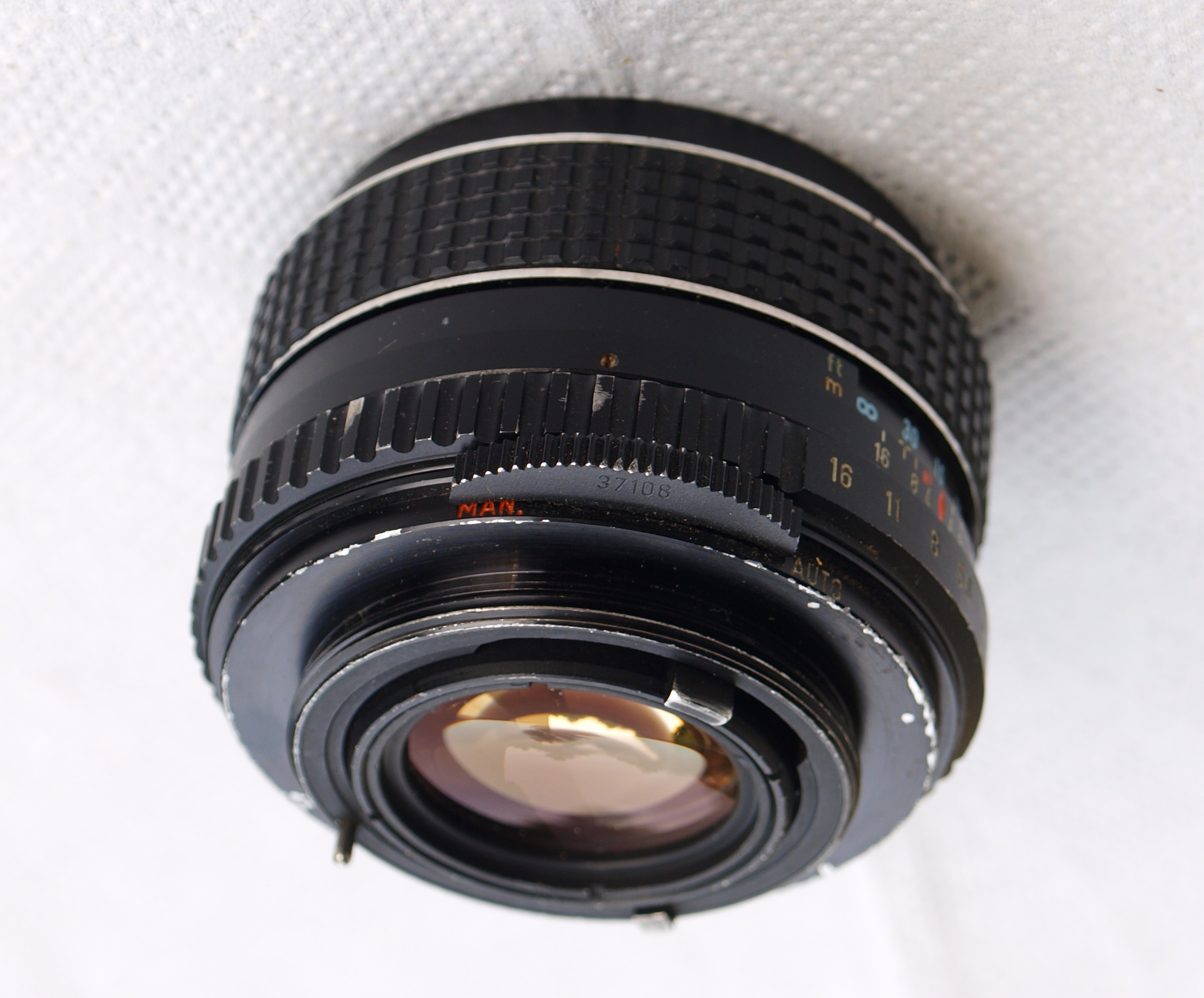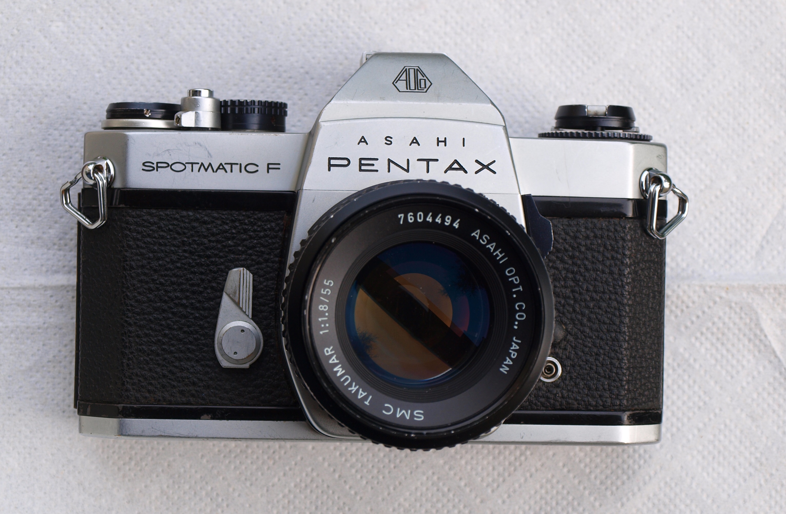 W Spotmatiku F pomiar może być dokonany przy otwartej przysłonie ze specjalnymi obiektywami, mającymi symulator przysłony. Jak ten Takumar (to ta dźwignia poruszająca się po obwodzie). Przy wykonywaniu fotki przysłona przymknie się do zadanej wartości, przy przełączniku ustawionym na "AUTO". Jednak sam przełącznik powinien się dać przesunąć "po obwodzie". Można obiektyw wtedy wykorzystać w lustrzankach bez automatyki przysłony (wczesne Praktice i Zenity).