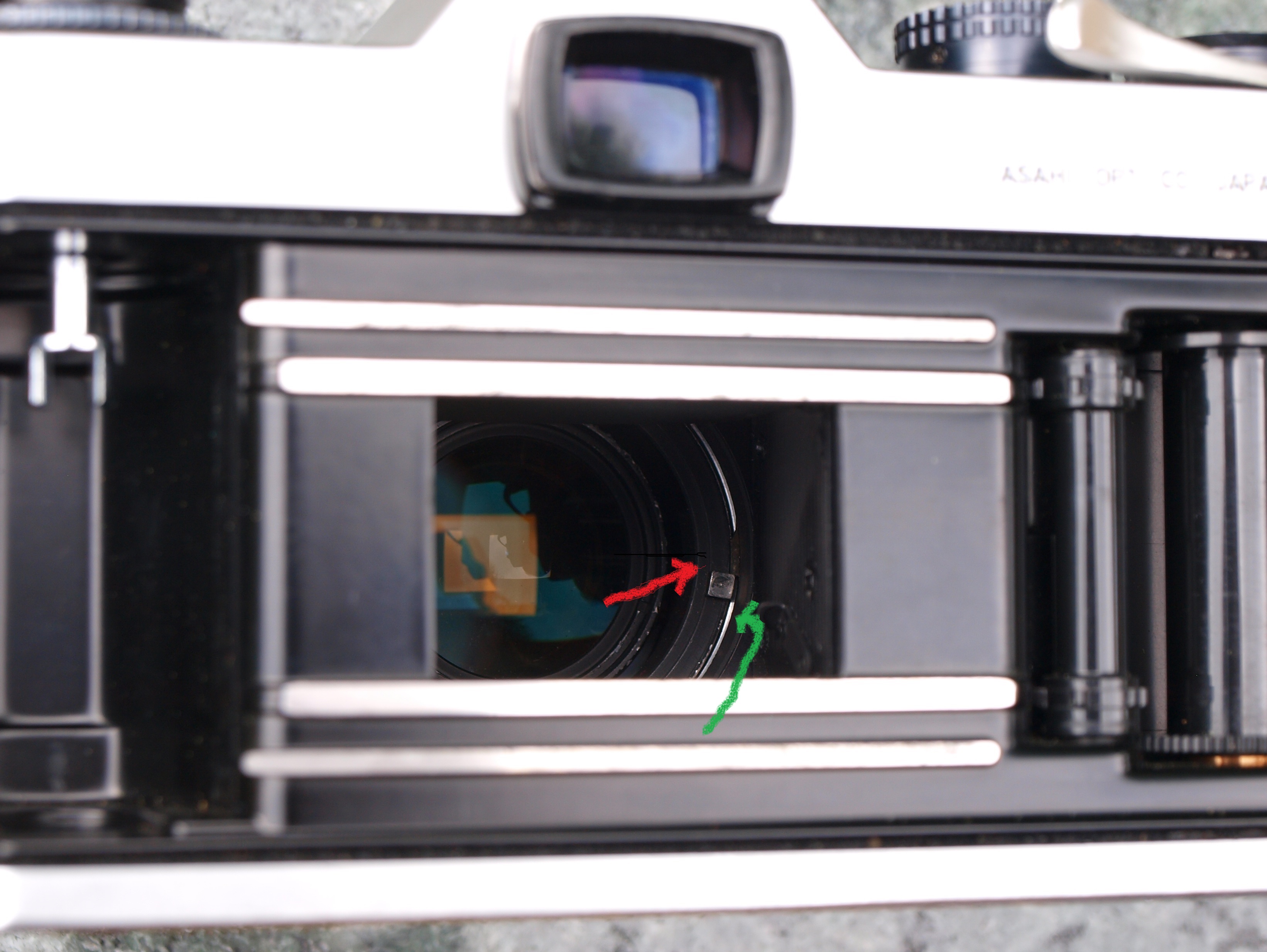 Aby rozwiać ew. wątpliwości zamieszczam trzy zdjęcia z kolorowymi strzałkami. Czerwona wskazuje prostopadłościenny nadlew na korpusie Takumara, służący do poprawnego ustawienia obiektywu względem korpusu aparatu - po prostu obiektyw należy wkręcić do oporu tak, aby ów nadlew oparł się o cienki zderzak w korpusie - oznaczony zieloną strzałką i widoczny przy powiększeniu zdjęcia wnętrza aparatu przy otwartej migawce.