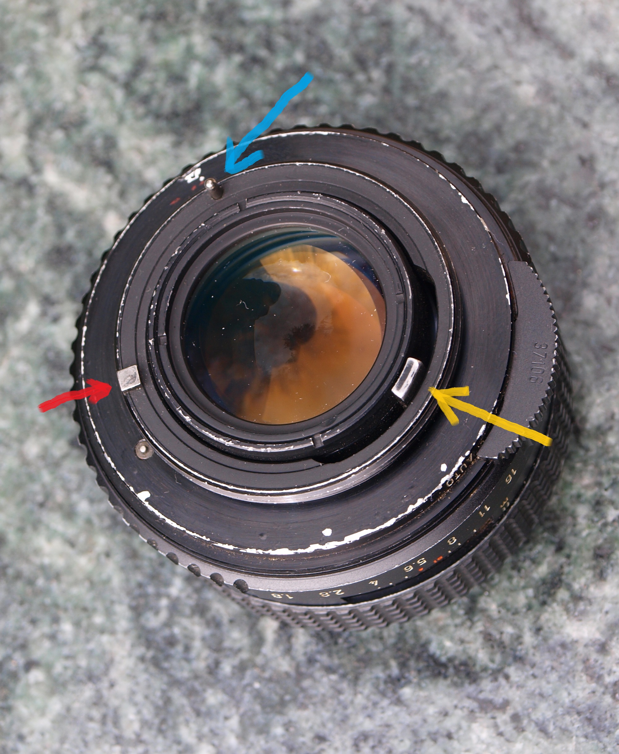 Dźwignia wystająca z obiektywu, oznaczona na żółto sprzężona jest z pierścieniem przysłony i przy jego obracaniu przesuwa odpowiedni zderzak w korpusie aparatu - oznaczony tym samym kolorem - informując układ pomiarowy o wartości nastawionej przysłony. Nigdy dotąd nie miałem do czynienia z Pentaxem i pierwszy raz widzę taki sposób "rozmowy" obiektywu z aparatem.