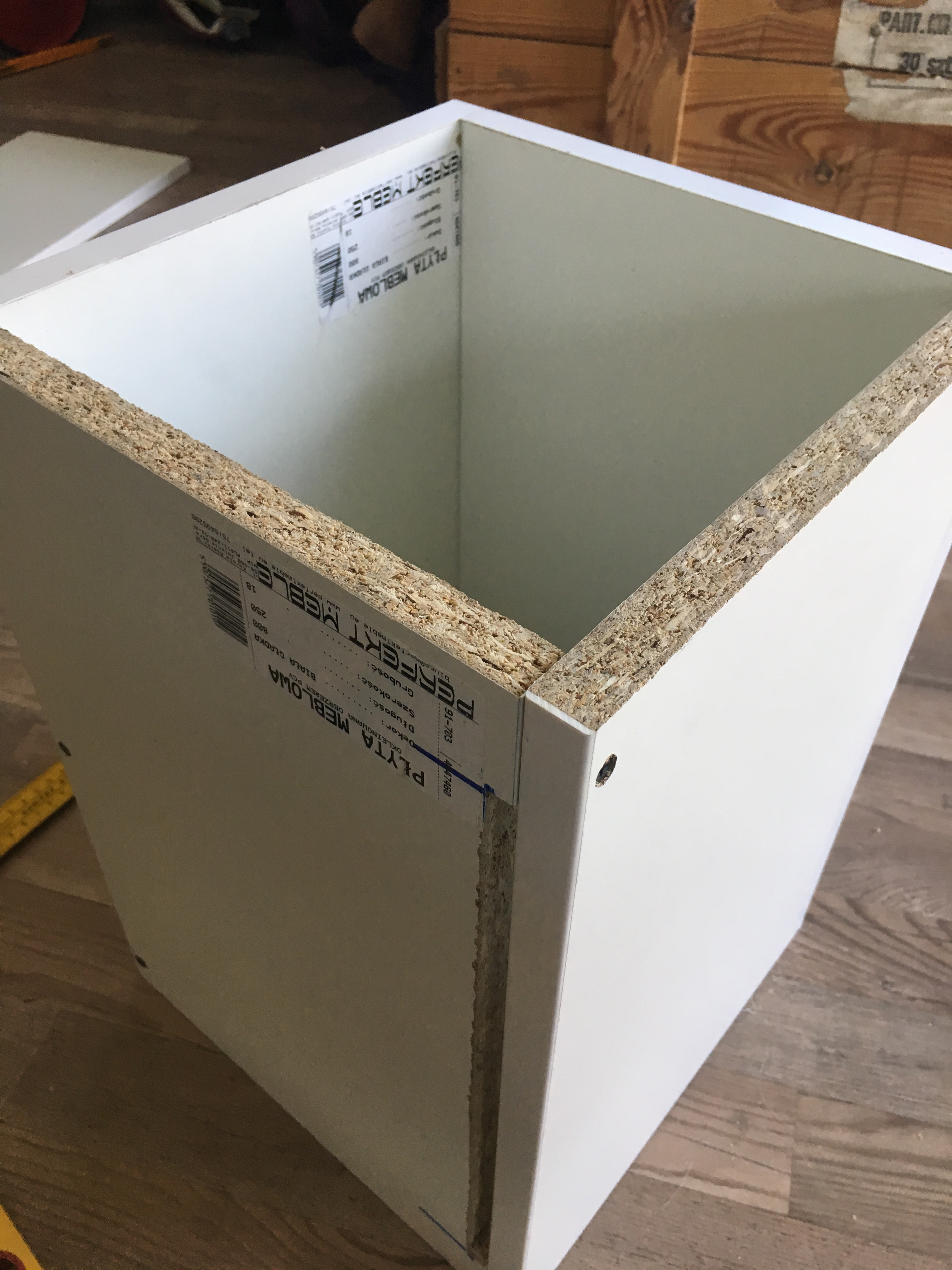 Pudełko składa się z 6 ścianek ;) z czego w jednej wykroiłem wcięcie na dłuższym brzegu (około 15mm), na długość około 32cm. To utworzyło szparę, przez którą wychodzi papier. Oś na którą zakłada się rolkę zrobiłem z "nogi do blatu z ikei" (można kupić osobno nogi), trzeba ją było przyciąć kątówką.
