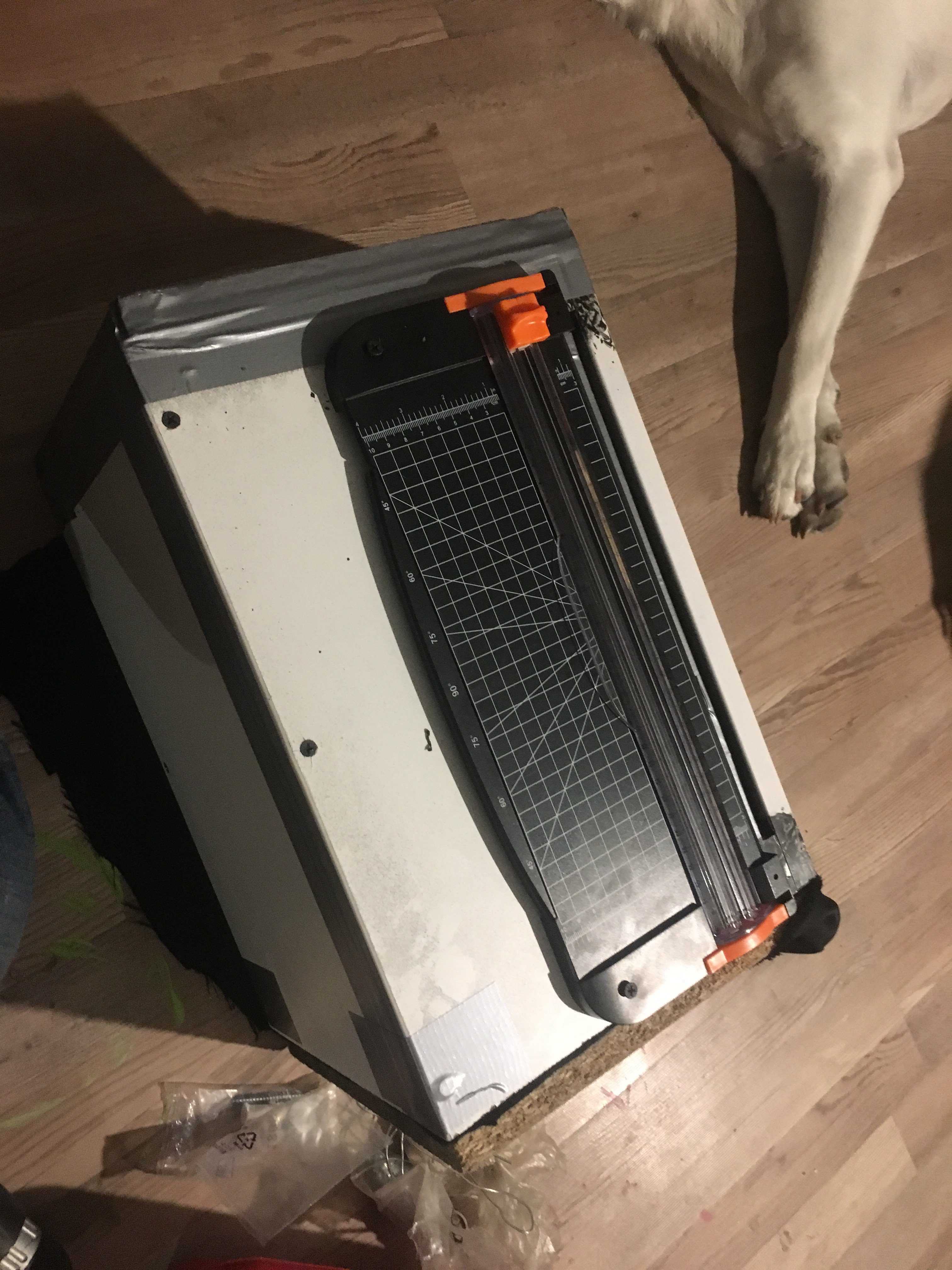 Brakuje mi zdjęcia z ostatnim dodatkiem: do tylnej ściany przybiłem tuckerem czarną szmatę, większą niż górna ściana i jak wytnę papier, to zakładam po prostu tą szmatę, żeby zakrywała ujście papieru i gilotynę. Można by pomyśleć jeszcze o klasycznym zamknięciu na zawiasach. Dwa tygodnie od uruchomienia miałem lekko zaświetlone "na niebiesko" 2cm papieru.