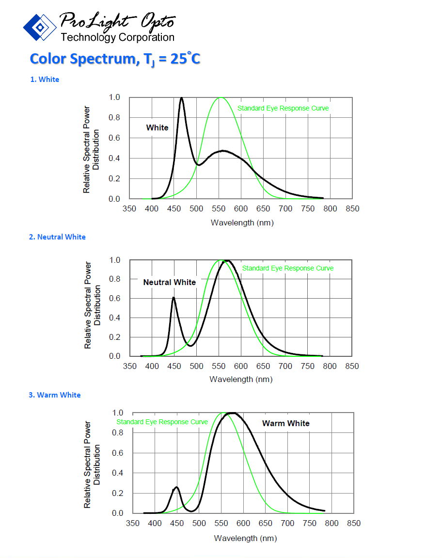 Dołączyłem poglądowo wykresy od różnych producentów LED-owych, aby zobrazować jak świecą takie ledy, aby wyjaśnić pojawianie się owego nietajemniczego niebieskiego (czytaj: Royal blue) pika, który jest właściwym emiterem światła w białym ledzie.