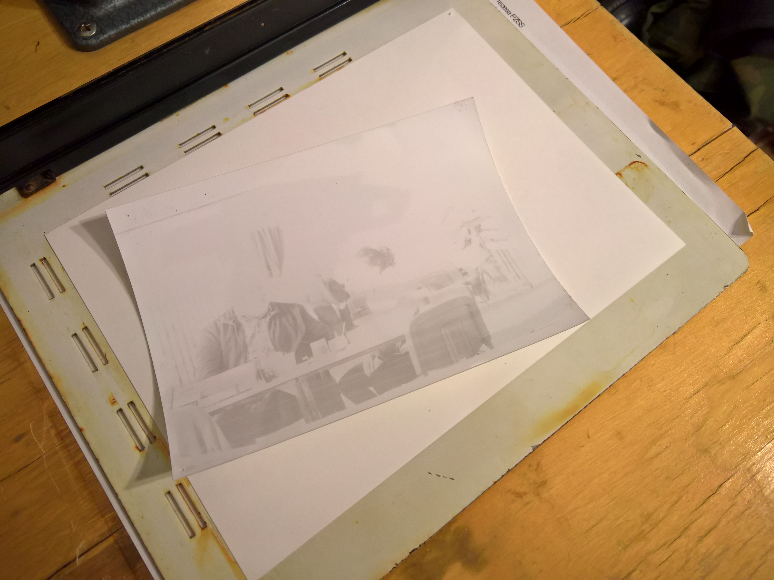 Z drżącymi rencyma i nogyma przystąpiłem do operacji. W zasadzie robiłem to aby spróbować, ponieważ nazwanie naprędce, bardzo naprędce ogarniętego pokoju ciemnią byłoby nadużyciem. Słowem, liczyłem się z tym, że papier zniszczę zanim jeszcze wyląduje pod powiększalnikiem. Jednak, o dziwo, nie. Jednak nie tak łatwo zaświetlić papier, jak to sobie wyobrażałem - no ale nie będę płakał z tego powodu ;) To jest pierwsza odbitka. Pomny mądrych rad postanowiłem... zrobić oczywiście odwrotnie, czyli najpierw zobaczyć, co się w ogóle stanie. Naświetlane przez dwie sekundy. Podbudowany poprzednim doświadczeniem tutaj poeksperymentowałem "na szybko" z czasami naświetlania. Tutaj natomiast trzecia odbitka, z czasem naświetlania ustalonym na ok. 13 sekund.