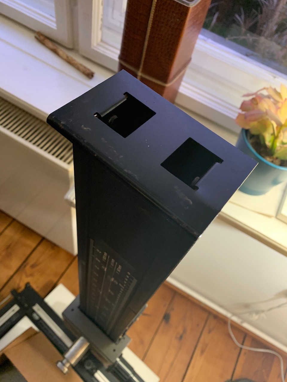 Zamierzam powiesić powiększalnik na ścianie. Udało mi się upolować oryginalny zestaw do montażu. Jeżeli chodzi o podstawę kolumny, to wszystko jest jasne. Natomiast mam problem z górą - dostałem profil w kształcie litery L - jak na zdjęciu, a góra kolumny jest zabudowana odkręcaną płytką, którą również zamieszczam. Zakładam, że będę musiał coś dorobić u ślusarza, natomiast nie wiem jak mam do tego podejść, a chciałbym to zrobić w sposób zbliżony do rozwiązania oryginalnego. Czy może ktoś z Was dysponuje tego typu powiększalnikiem zamontowanym na ścianie w oryginalnej konfiguracji? Ja mam kolumnę PRO, stosowaną w wysokich modelach od 805 w górę...