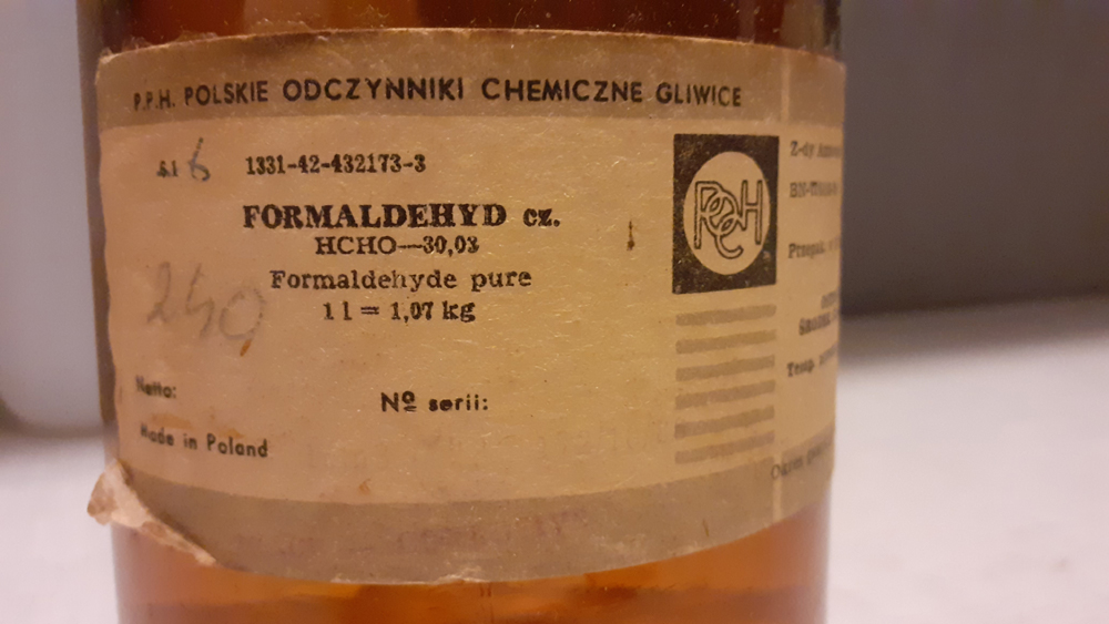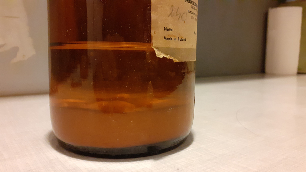 Próbowałbym ratować wodą demi w małej ilości i próbować rozpuścić osad (pewnie woda częściowo odparowała, powstał roztwór przesycony i wytrącił się formaldehyd). Edytka: w zasadzie przefiltruj najpierw, osad spróbuj rozpuścić w małej ilości wody demi.