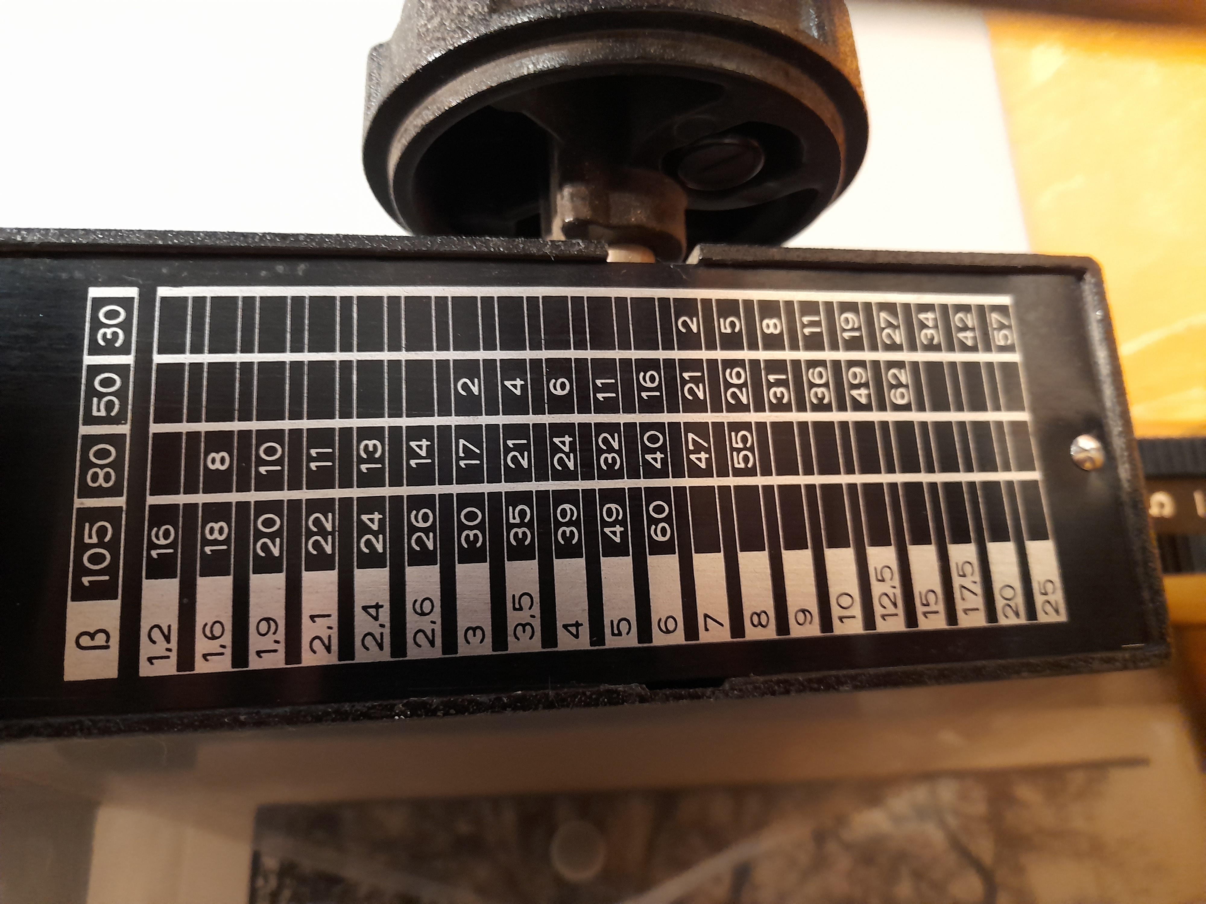 2. Skala/tabela na powiekszalniku. Górna część może wskazywać ogniskowe, a ta część po lewej? Jak to odczytywać?