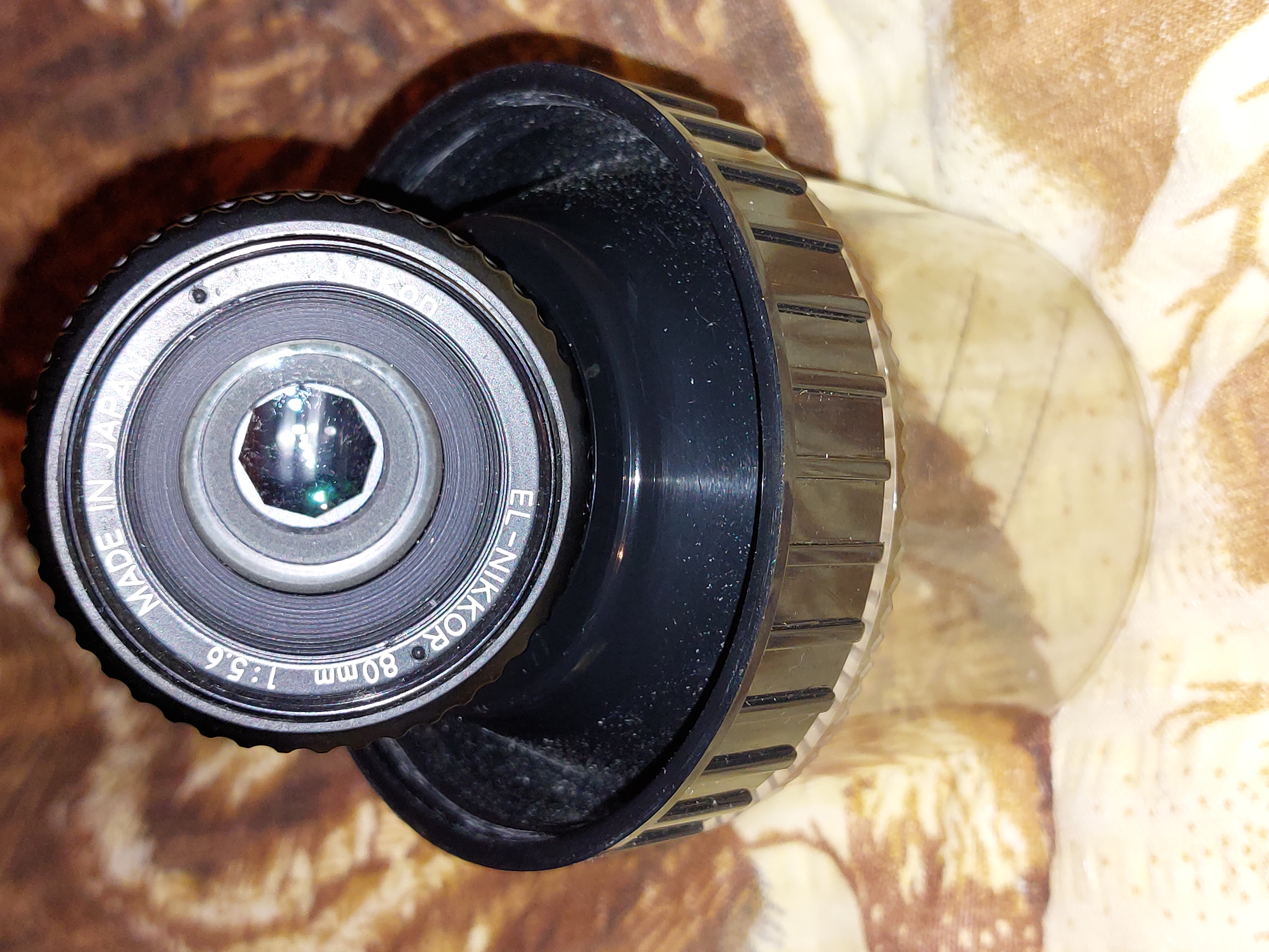 Obiektyw drugi to EL Nikkor 1:5,6 80 mm z podświetlaną skalą przyslony. Konkretnie do sprzedaży jest egzemplarz widoczny na zamieszczonym zdjęciu. Obiektyw sprawny, bez widocznych oznak użytkowania. W komplecie z obiektywem jest oryginalne etui (czarna podstawa z gwintem do wkręcenia obiektywy i przezroczysty klosz zamykający całość. Wszystko to w pudełku kartonowym obiektywów tej marki lecz innego typu.
