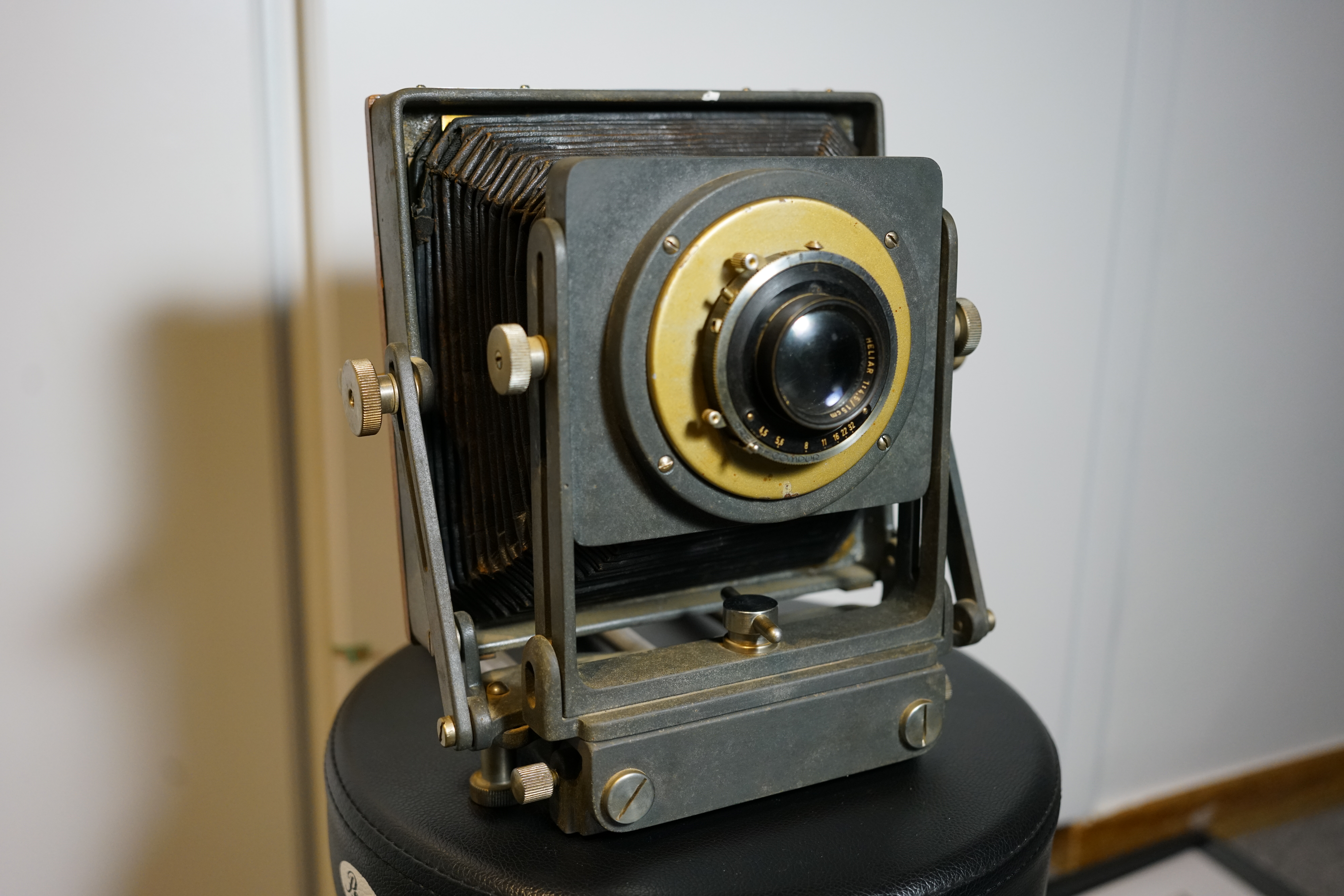 Sam aparat jest jak na mój gust duży, z jakiegoś lekkiego metalu, przedziwnej, moim zdaniem genialnej konstrukcji nie do zajechania. Pięknej jakości śruby, prowadnice, wsio chodzi jak szwajcarski zegarek, co mnie mile zaskoczyło. Miech ma dwa uszkodzenia, o czym wiedziałem wcześniej. Tyłek 9x 12 z jakiegoś bardzo fajnego drewna, ładnie wszystko spasowane. Obrotowy do portretu i krajobrazu. Drewniana kaseta podwójna, superfajnie dopasowana i w pięknym stanie. Na wyciągniętym miechu ma to jakieś 40 cm.