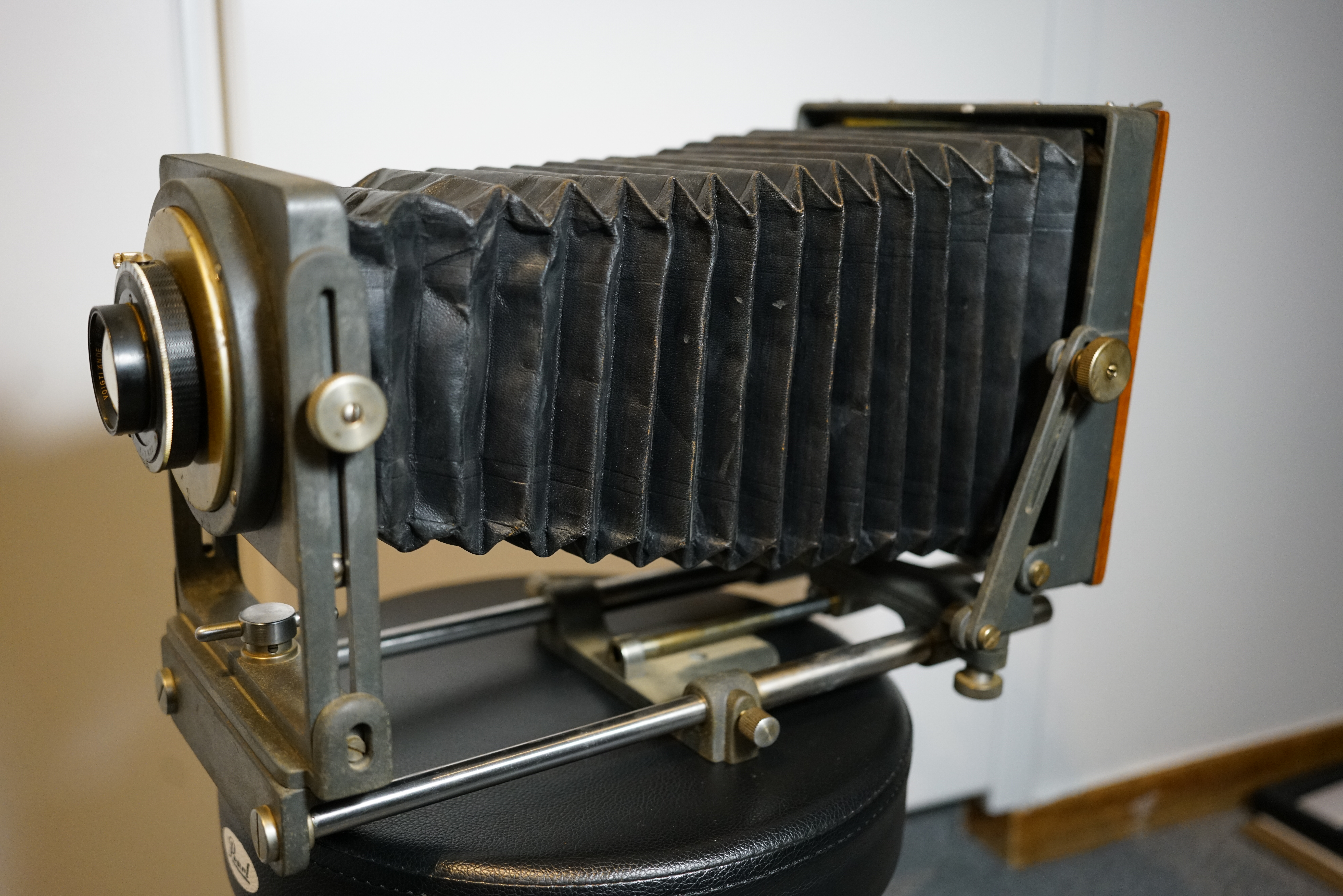 Wygląda to trochę jak kamera zbudowana z wykorzystaniem elementów wielkoformatowego powiększalnika. Metalowa konstrukcja, brak oznaczeń, oraz to że nie da się ścisnąć miecha do pozycji umożliwiającej ostrzenie ma odległe obiekty to przypuszczenie czyni uzasadnionym.