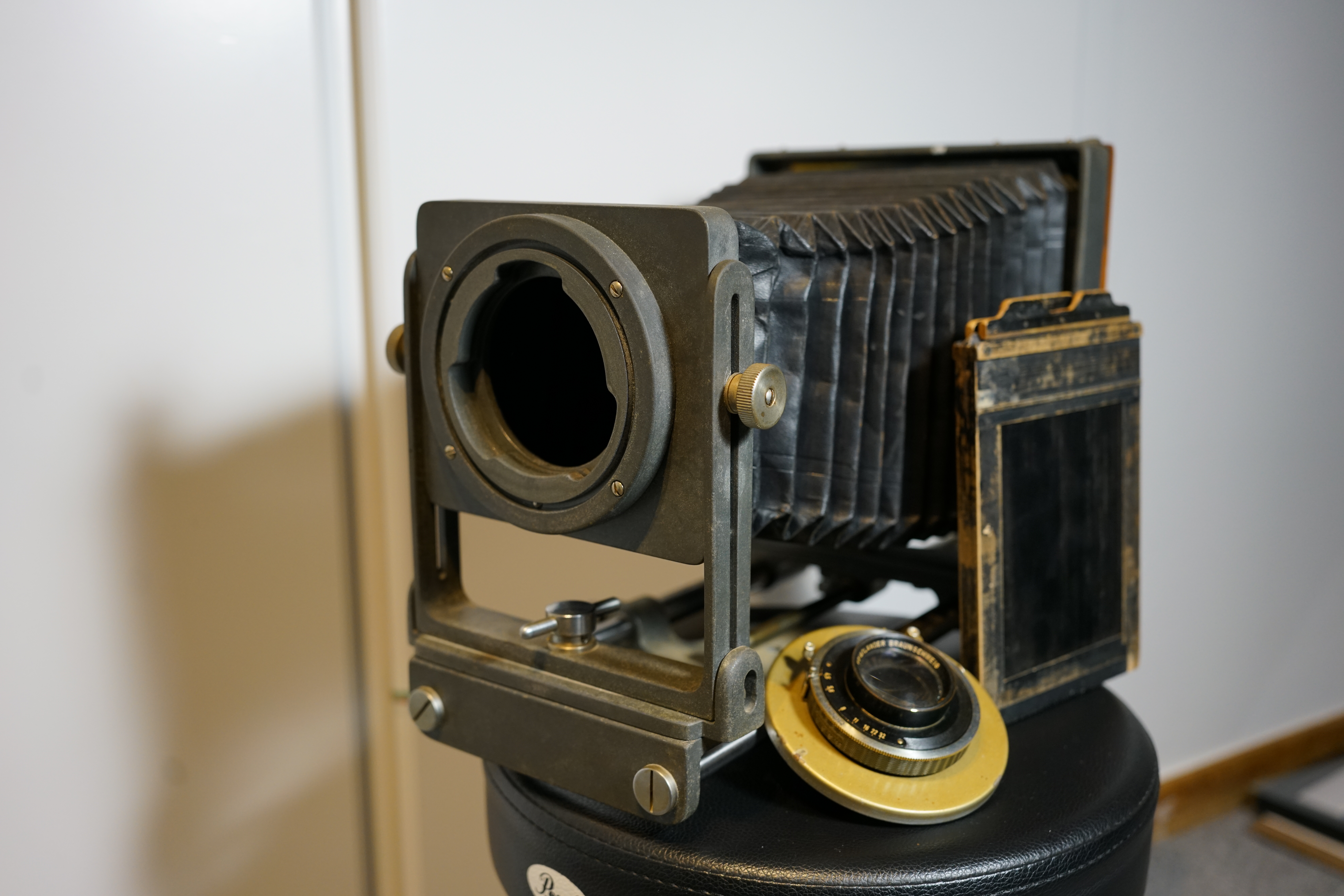 Wygląda to trochę jak kamera zbudowana z wykorzystaniem elementów wielkoformatowego powiększalnika. Metalowa konstrukcja, brak oznaczeń, oraz to że nie da się ścisnąć miecha do pozycji umożliwiającej ostrzenie ma odległe obiekty to przypuszczenie czyni uzasadnionym.