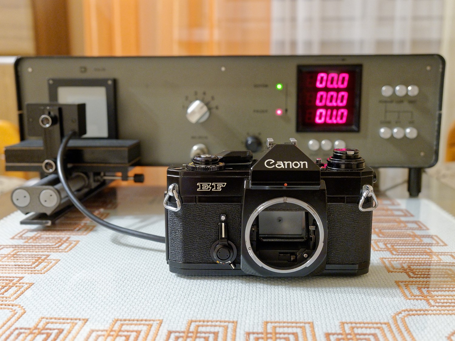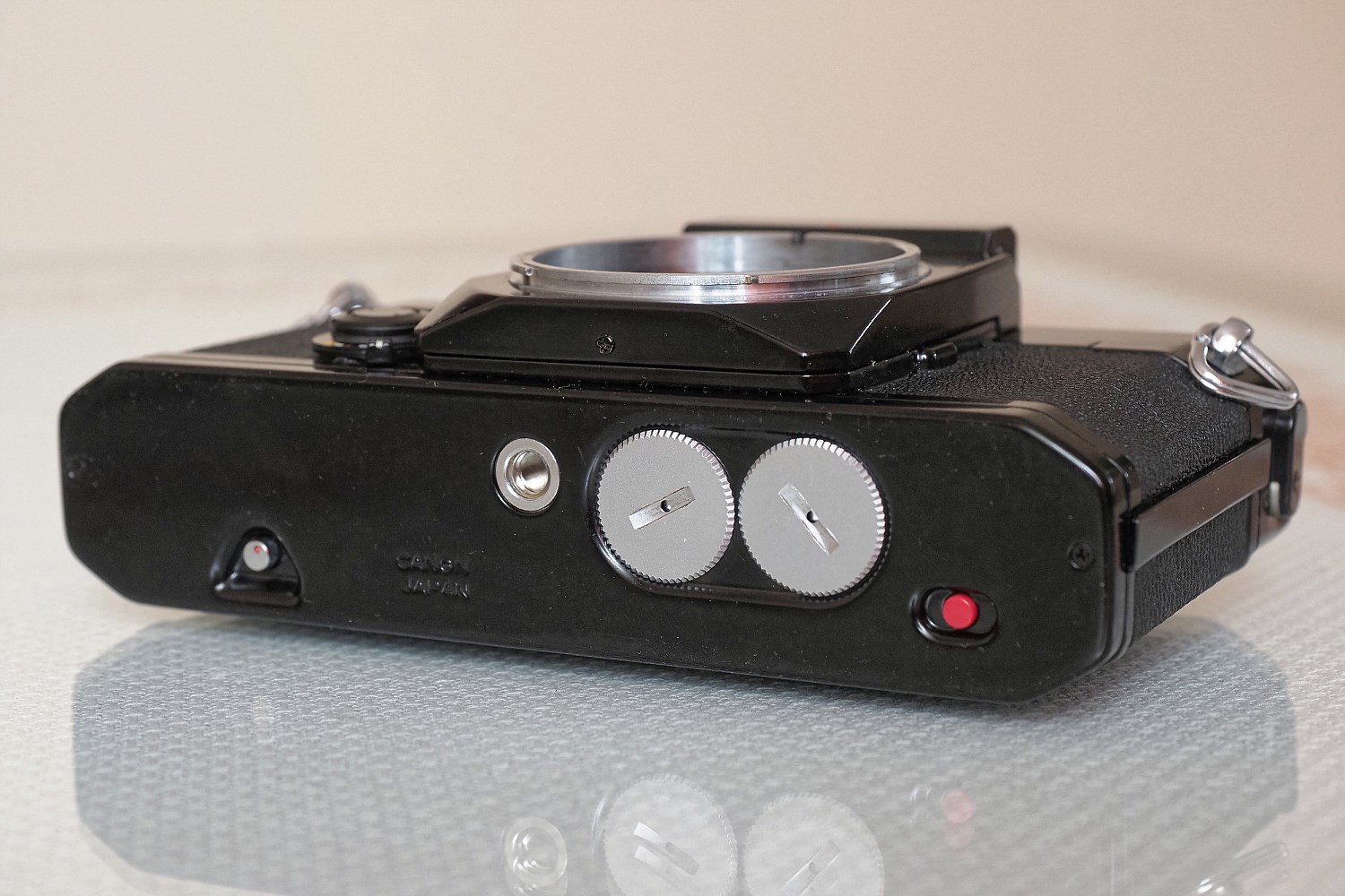 Pancerny aparat z mocowaniem obiektywów przez bagnet FD, sprawny, gotowy do użycia. Migawka realizuje właściwe czasy ekspozycji przy wszystkich nastawach. Dioda w układzie kontroli zasilania i długich czasów ekspozycji działa. Samowyzwalacz „rześki”, układ wstępnego podnoszenia lustra w pełni funkcjonalny. Igła światłomierza widoczna w celowniku działa bardzo stanowczo - co wynika z zastosowania jako elementu pomiarowego fotodiody krzemowej nieobciążonej bezwładnością typową dla fotooporników CdS. Wskaźnik wybranego czasu naświetlania odpowiada nastawom na pokrętle. Dźwignia naciągu migawki i przesuwu filmu działa lekko i gładko.