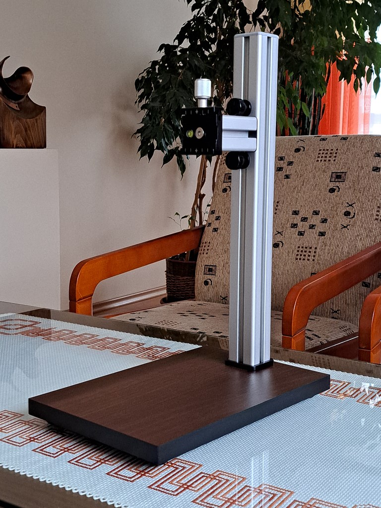 Odstąpię ramię do reprodukcji, montowane na kolumnie powiększalnika, pozwalające na stabilne zamocowanie aparatu z osią obiektywu skierowaną prostopadle do płyty, co umożliwia m.in. na wygodne "skanowanie" negatywów i slajdów z wykorzystaniem aparatu cyfrowego.