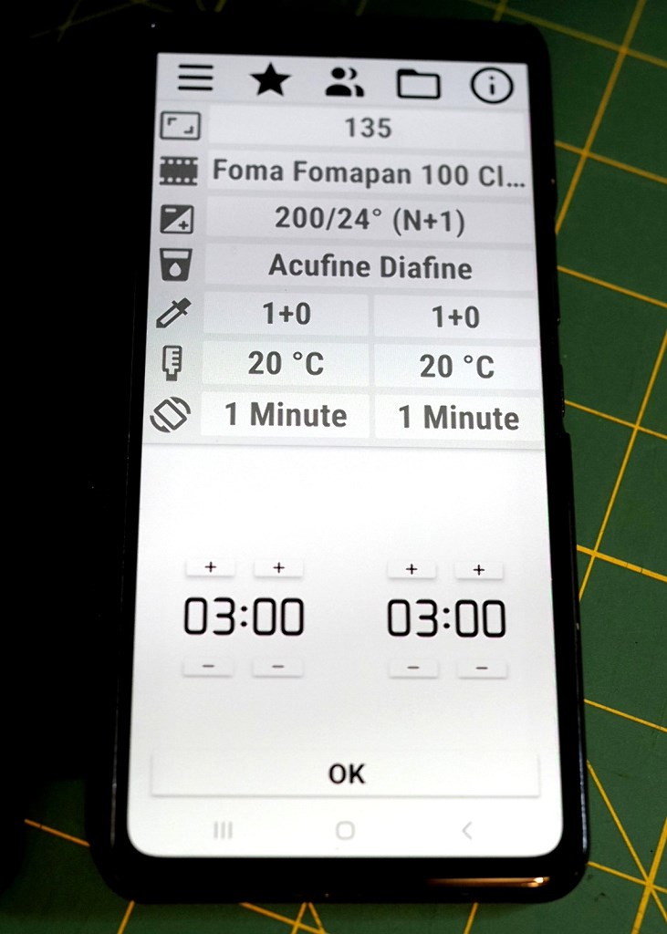 Przypadkowo odkryłem, że w używanej przeze mnie aplikacji Film Developer Pro przewidziano wykorzystanie wywoływaczy dwukąpielowych, udostępniając konfigurowalny moduł odmierzania czasów wg zaplanowanego scenariusza obróbki.