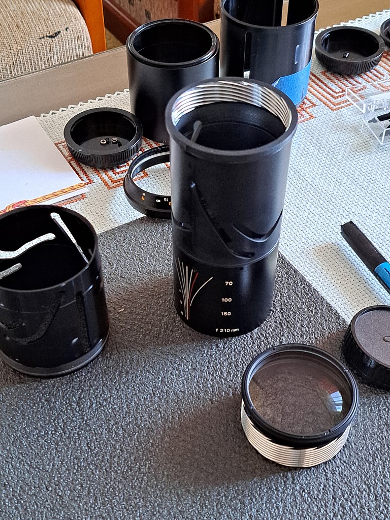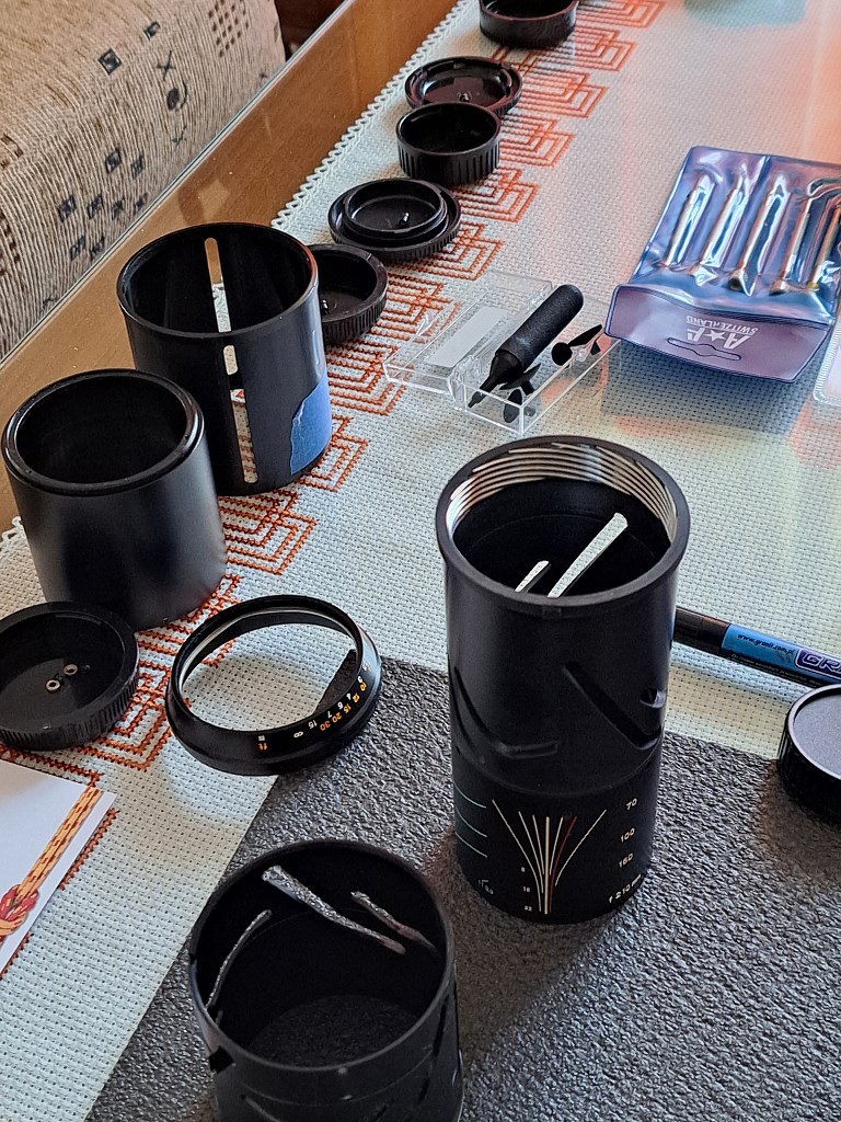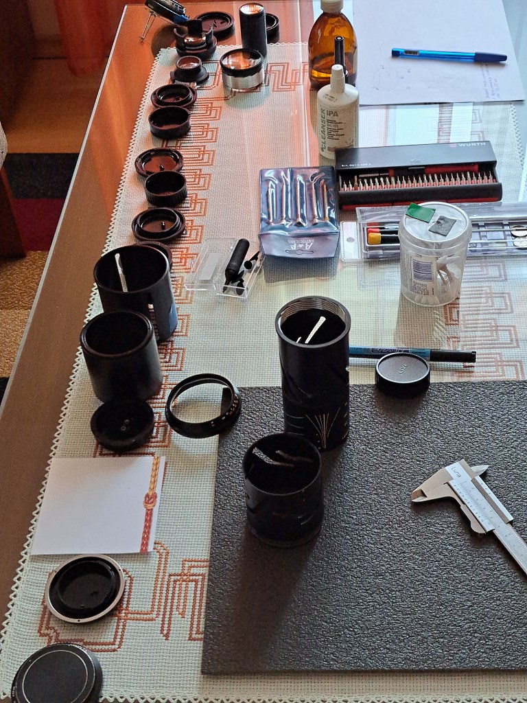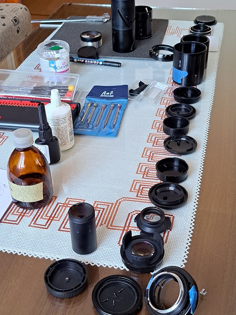 Obiektyw rozebrałem doszczętnie - notując w trakcie usytuowanie poszczególnych istotnych części i wykonując odpowiednie znaczniki pozwalające później zmontować poszczególne podzespoły z zachowaniem pierwotnych pozycji. Usunąłem stare smary, dokładnie oczyściłem i odtłuściłem wszystkie elementy mechaniczne. Poszczególne elementy optyczne udało się wyczyścić tak, że obecnie są sterylnie czyste, a przy tym nienaruszone zostały ich powłoki przeciwodblaskowe.