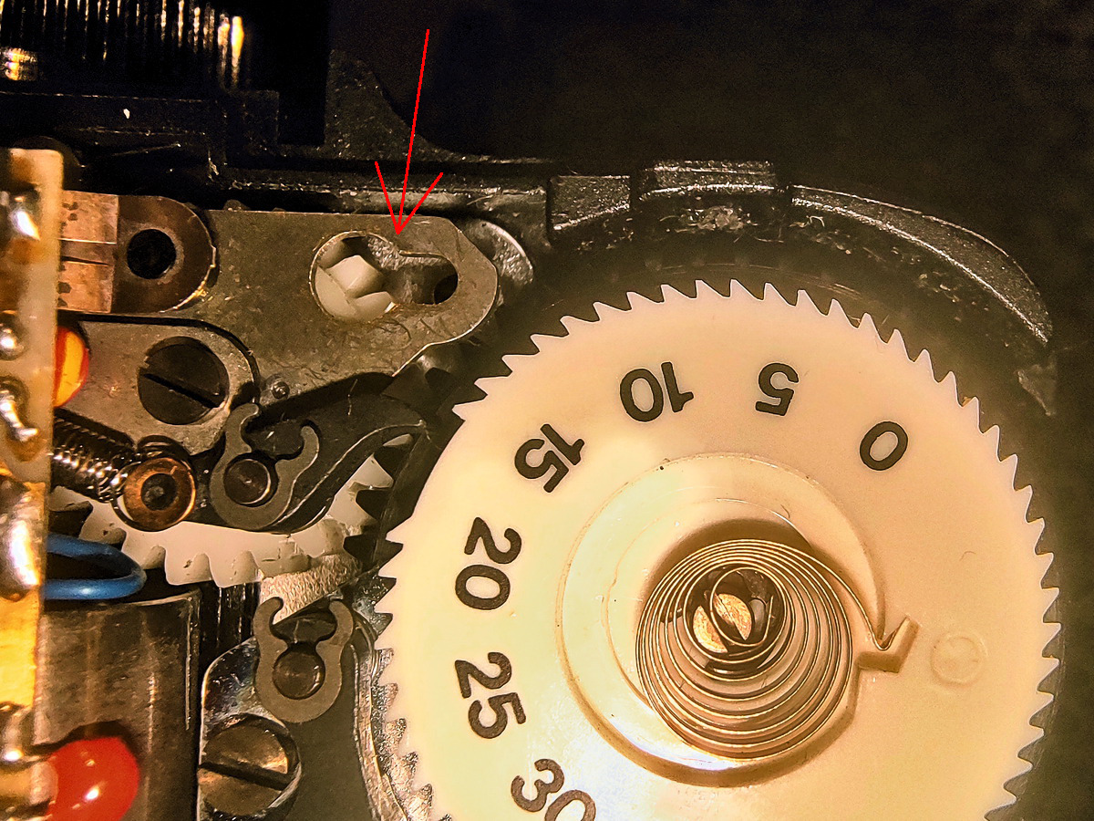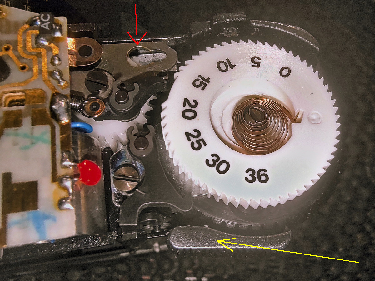 Próbuję regulować odmierzany elektronicznie czas migawki, a tymczasem zablokowała się dźwigienka naciągu. Cały mechanizm, nylonowe kółka zębate, blaszki, da się tym poruszać i widać, że mechanizm funkcjonuje. Wyskoczył mi ten stalowy bolec spustu i jest kłopot z jego odpowiednio głębokim włożeniem. Przy okazji zablokowała się ta dźwignia naciągu.