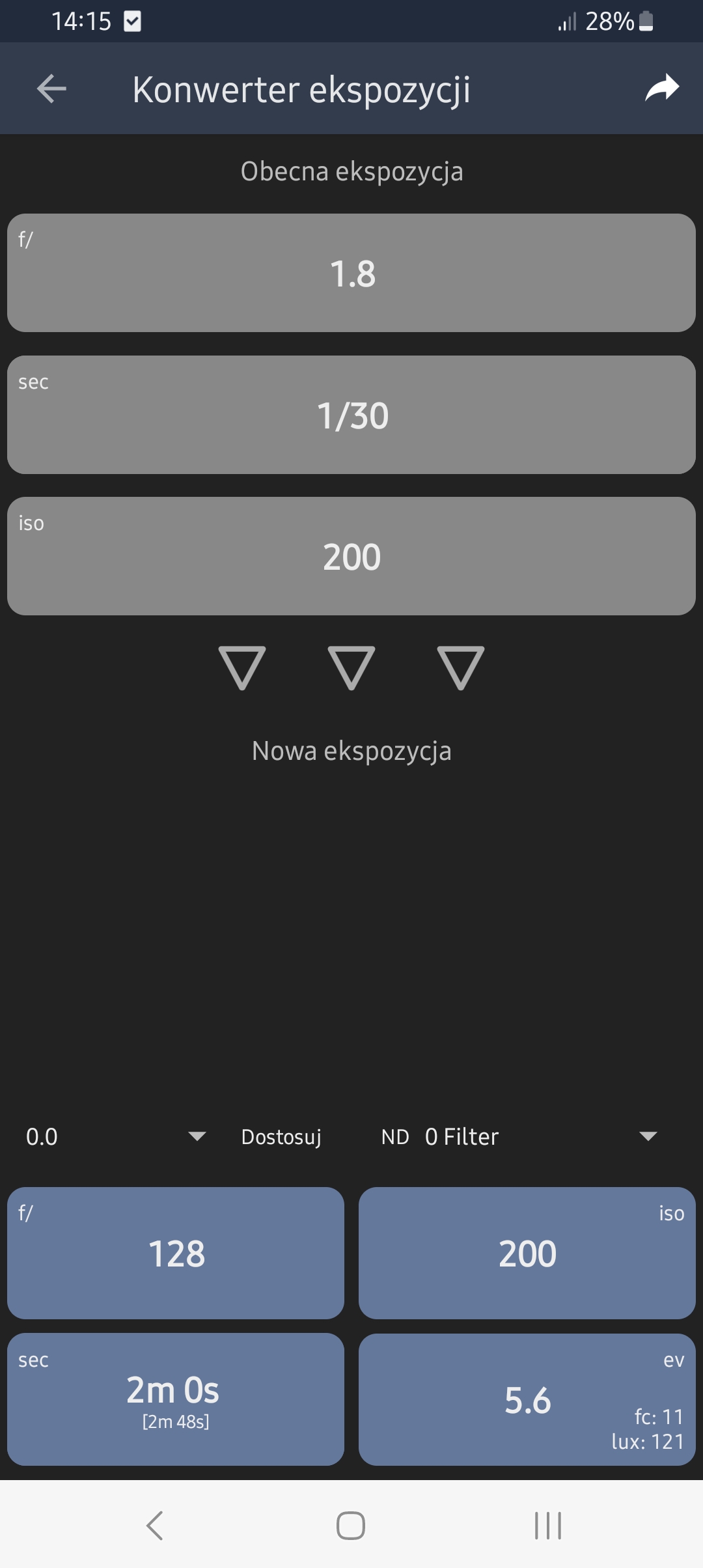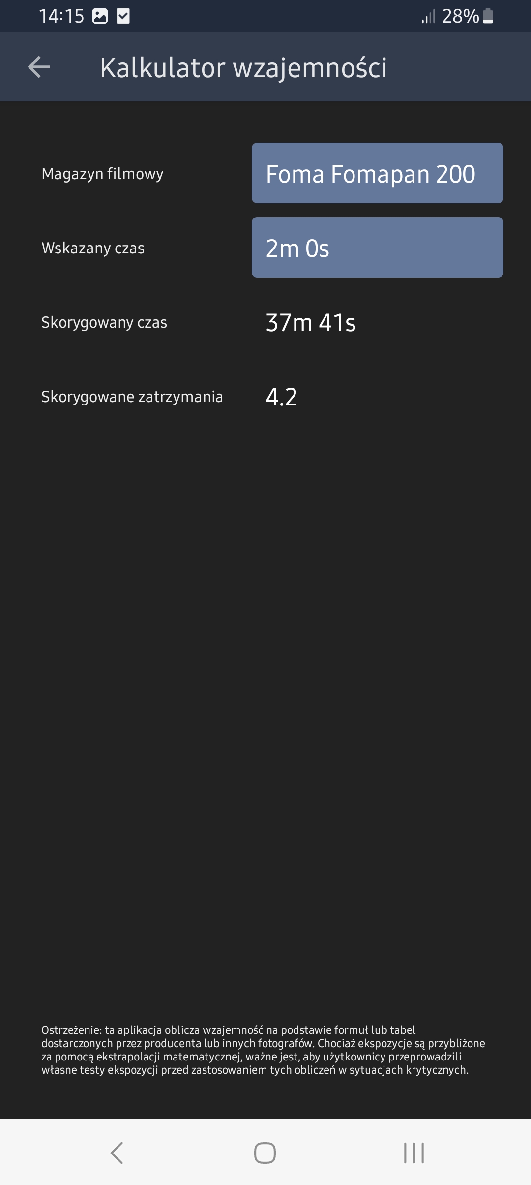 Ale po kolei. Po pierwsze, chciałem mieć coś pod ręką, czyli w telefonie. Najlepiej, gdyby to był jakiś program/aplikacja/wzór. Znalazłem aplikację "Light Meter", z kilkoma ciekawymi możliwościami. Czyli jest tam opcja przeliczenia ekspozycji i opcja kalkulatora wzajemności, z całkiem sporą bazą negatywów. Wadą aplikacji jest to, że ma ustawione "sztywne" przysłony. Czasy i przysłony w aplikacji wybiera się z listy. Mój aparat, z przysłoną 143 nie łapie się na żadną tabelkę. Do tego przeliczanie i konwersje skutkują zaokrągleniami, i to mocno w dół.