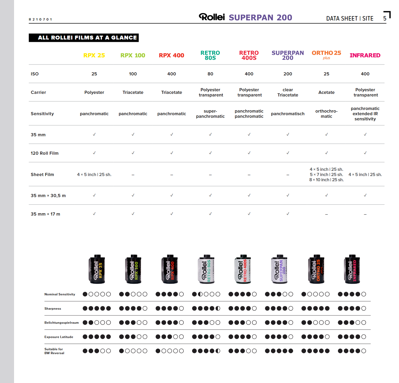 Repackaged as Rollei Superpan 200, Rollei Retro 400s, Rollei Infrared 400, Silberra Pan 160 / Ultima 160, Silberra Pan 100 / Ultima 100, CatLabs 320 Pro and JCH Street Pan.