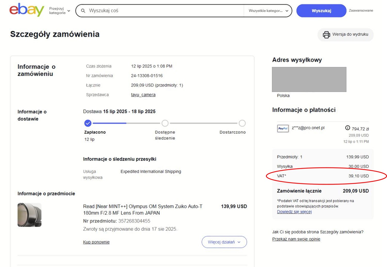 - kupił na ebay aparat, zapłacił VAT i cło, a przy okazji został złupiony przez firmę kurierską za "usługę"