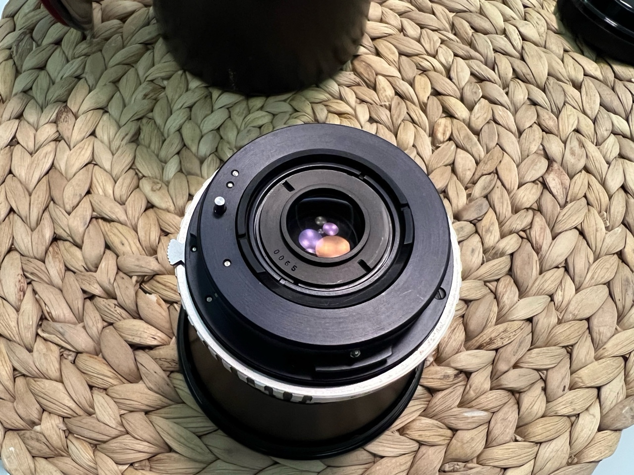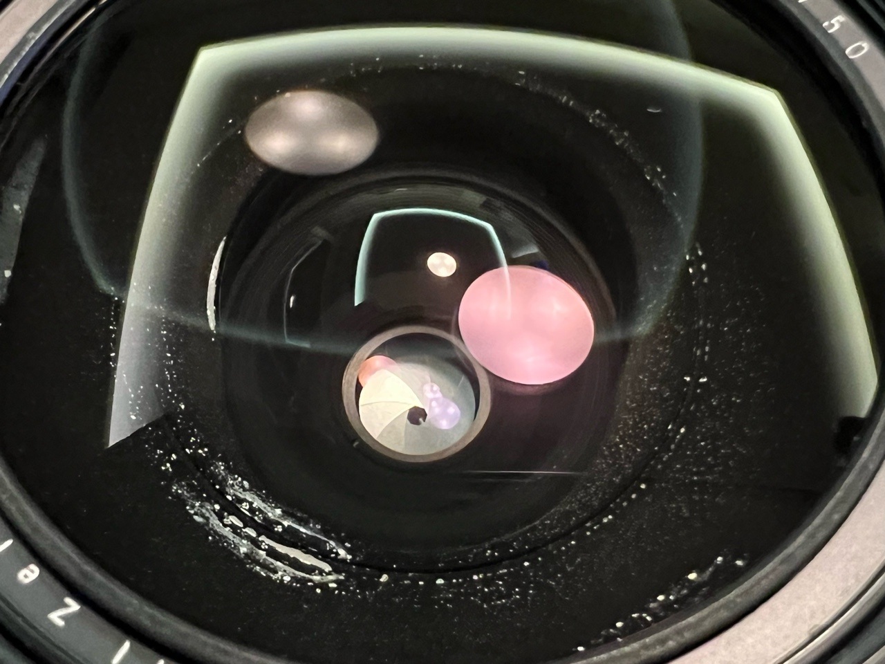 Ta biała plama widoczna pod przednią soczewką, to typowa przypadłość tego modelu - czarna matowa farba wewnątrz pierwszej grupy soczewek po prostu się utlenia tworząc białe plamy. Niestety, nic z tym nie można zrobić, bo przednia grupa fabrycznie jest produkowana w całości i nie da się jej rozmontować. Tak stwierdził serwis. Serwis tez potwierdza, ze nie należy się tym przejmować, gdyż nie ma to wpływu na zdjęcia. Istotnie nie ma. Zrobiłem nim kilka rolek.