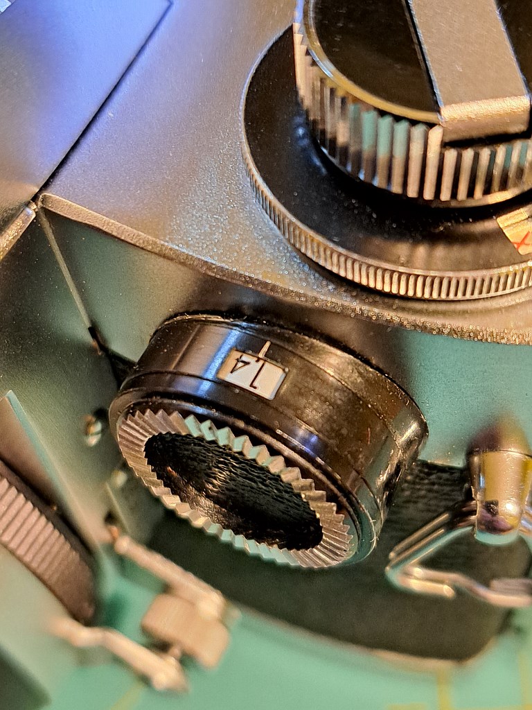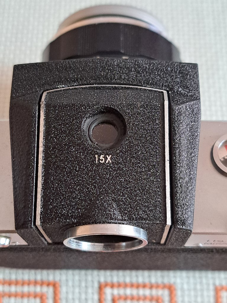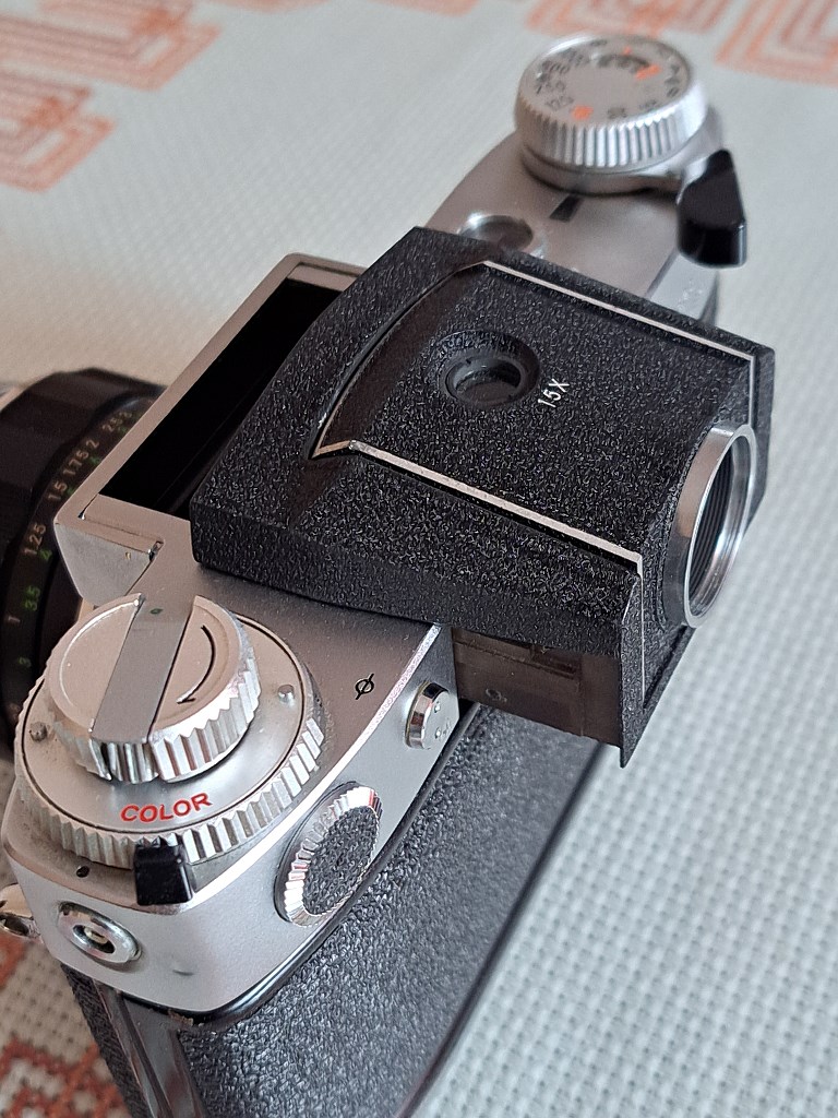 2) Wspomniany w poprzedzającej wypowiedzi wizjer 5x/15x to ciekawe akcesorium. To swego rodzaju kominek, który w pozycji złożonej wygląda jak zwykły pryzmat - tyle, że w jego okularze nic nie widać. W tej pozycji do podglądu służy lupa o powiększeniu 15x, przez którą można obserwować tylko centralną część kadru, co pomaga w ekstremalnie dokładnym ustawieniu ostrości, Po obróceniu centralnej części tego wizjera do pozycji pionowej można obserwować cały kadr, a to w powiększeniu zauważalnie większym niż w przypadku celownika pryzmatycznego. Co ciekawe, można wtedy korzystać ze światłomierza wbudowanego w korpus - a nie w pryzmat jak jak w Nikonie F i F2, gdzie po wymianie celownika na kominek traci się możliwość pomiaru światła przez obiektyw.