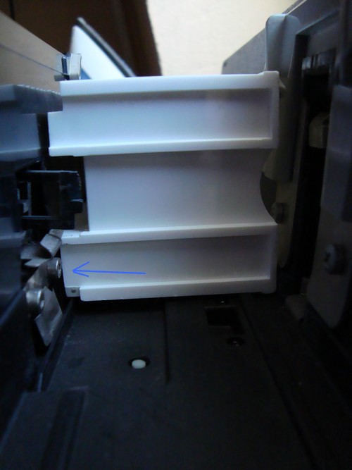 to pomarańczowe to ramię wsuwające slajdy do wnętrza rzutnika (pomarańczowa część jest od środka, a zębatka od zewnątrz).