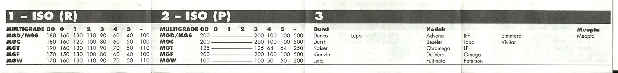 zrobiłem kiedyś tabelkę na podstawie ulotek dołączonych do papierów. tabela może być mało wiarygodna, bo nie wiadomo czy dotyczy meochroma, czy meocolora czy co? mnie to nie przeszkadzało, bo albo robiłem metodą rozdzielonych kontrastów, albo normalnie, albo twardo. także tego.janykiel pisze:A istnieje coś takiego do Meopty?