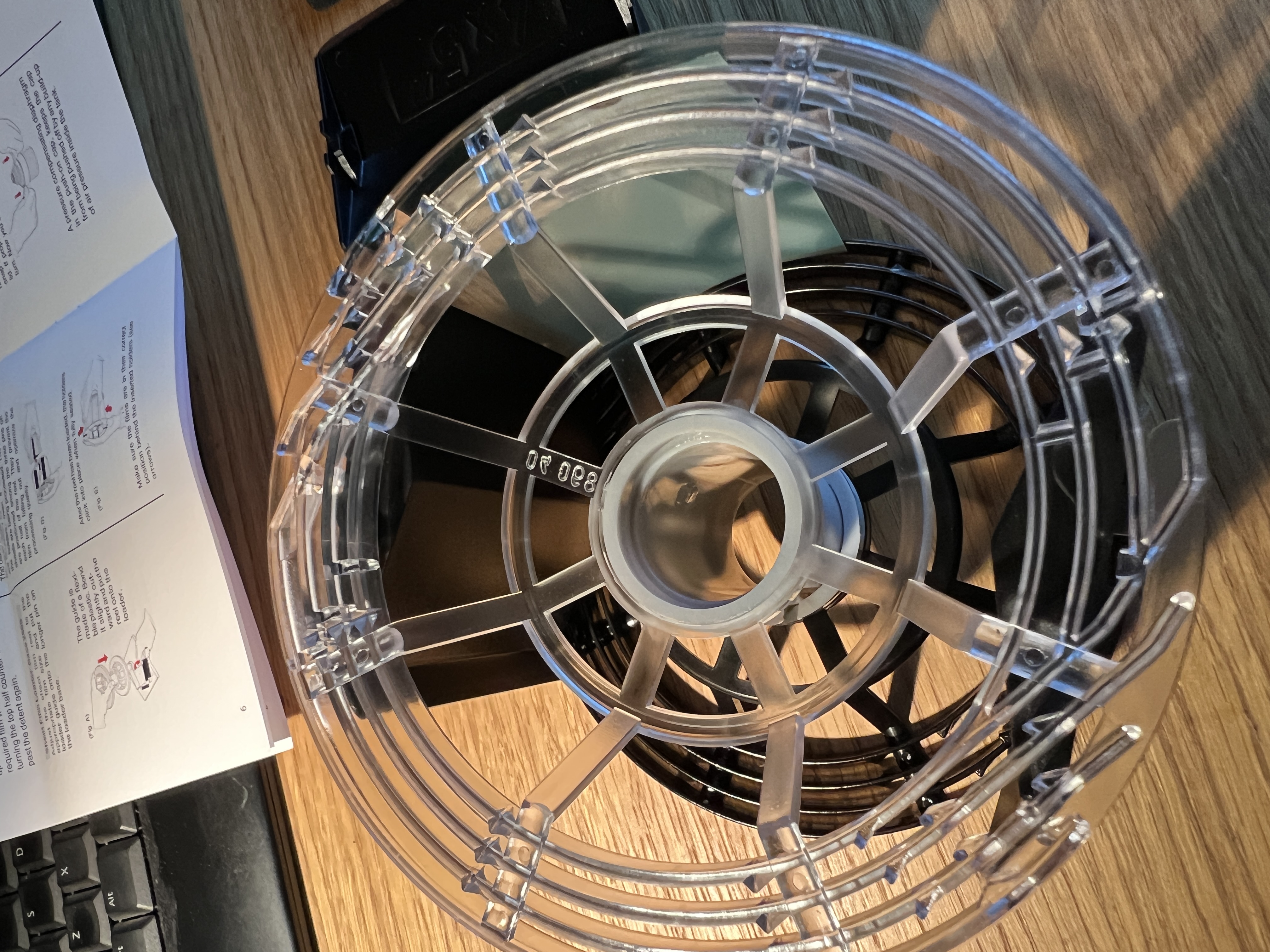 Coś w tym musi być, bo szpula 2509n obsługuje trzy formaty błon ciętych: 6,5x9 cm, 9x12 cm i 4x5 cala. Do formatów 9x12 i 4x5 są wspominane płytki (ponoć mają też wpływ na dystrybucję chemii przy wywoływaniu rotacyjnym) a dla 6,5x9 nie ma, bo podobno są niepotrzebne. Prawdopodobnie dlatego, że 6,5x9 mają zbyt małą wysokość (ok. 6,4 cm wsuwane dłuższym bokiem w rowki szpuli) by się tak wygiąć by zagrozić sklejeniem z sąsiednią błoną.