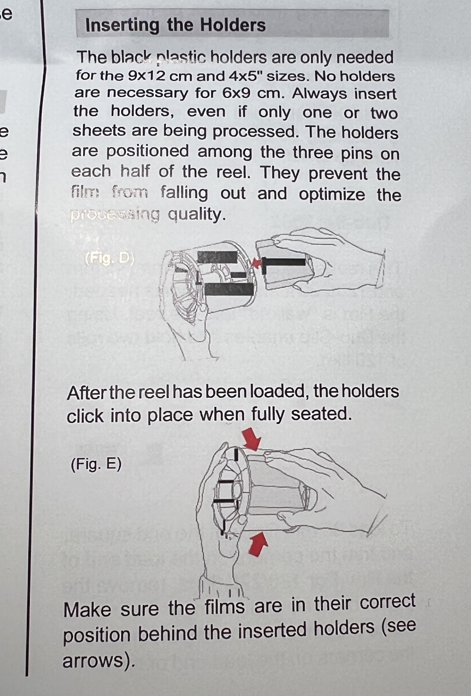 Producent stanowczo zaleca stosowanie załączonych płytek, nawet jeśli wywołujemy tylko jeden, dwa arkusze błony ciętej (nie dotyczy formatu 6,5x9 cm). W instrukcji dołączonej do mojej szpuli tekst jest zredagowany bardziej jednoznacznie (No holders arę necessary for 6x9 cm). Wygląda to tak: Z powodu braku kliszy 9x12 wstawiłem - dla celów poglądowych - szitkę 6,5x9 cm "na sztorc". Coś chyba widać.