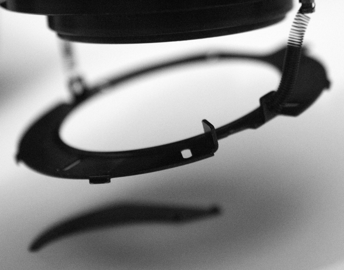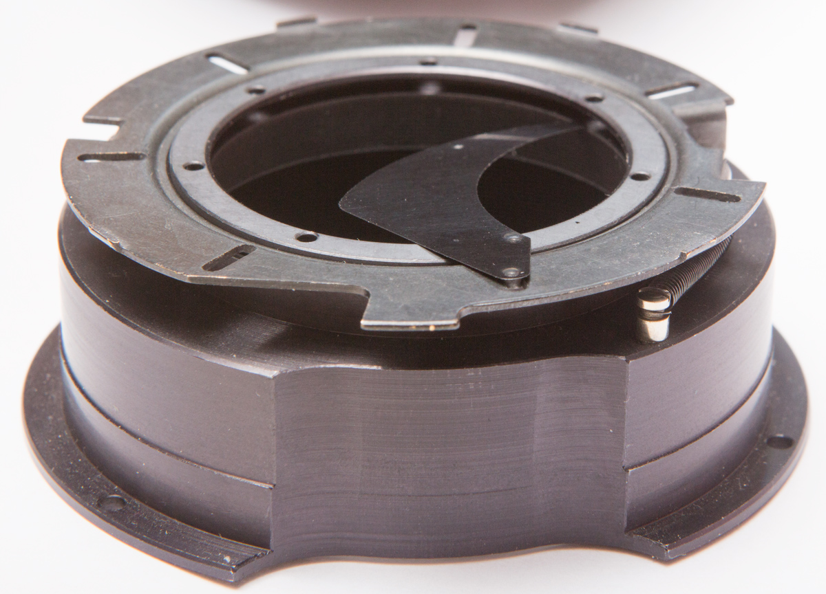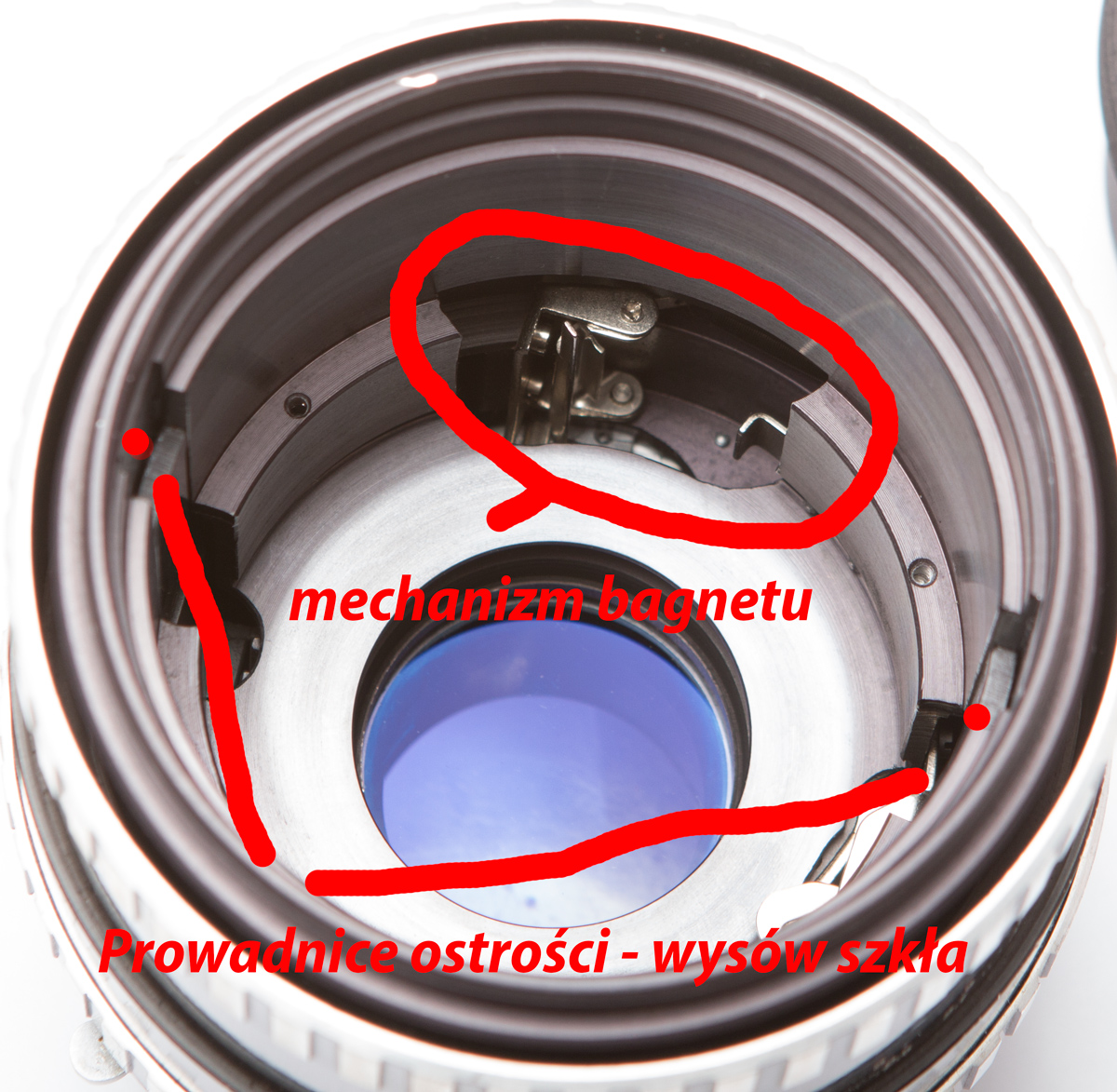 W korpusie są 2 prowadnice, dla mechanizmu ostrości wysuwają i cofają przednia soczewkę. Listki trzymane są na kawałku metalowego na 2 cm pierścienia, który połączony jest z blaszka 2 sprężynkami, blaszka ta trzyma te "bagneciki" czy trzpienie na listkach.