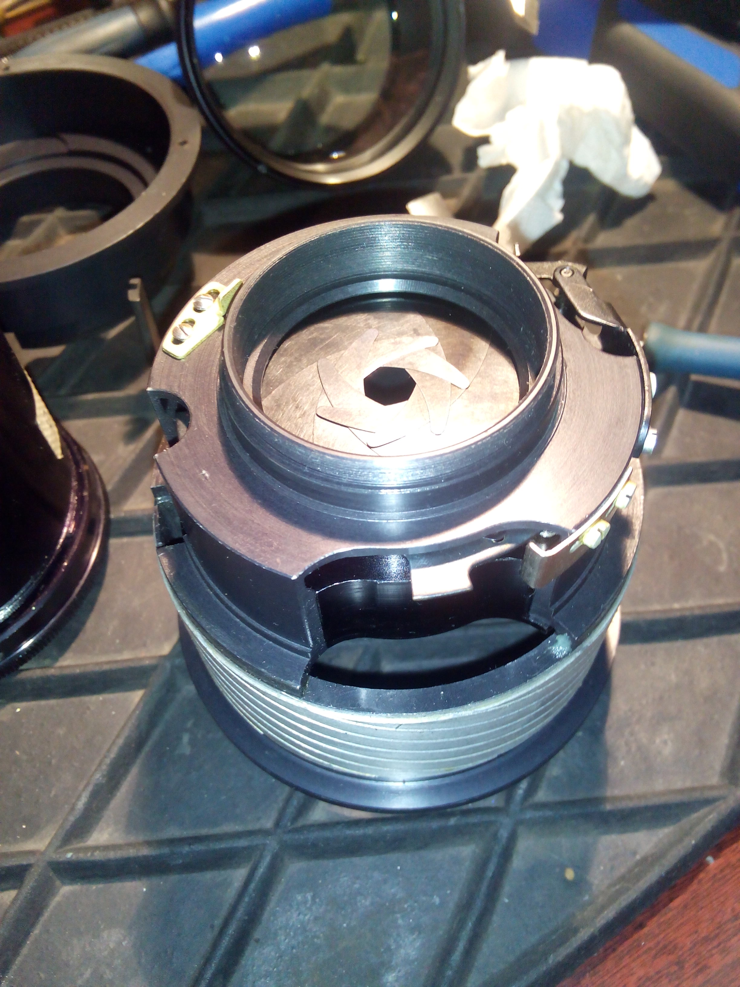 Już zrobione. Tylko na stronie czarnobialego kwadratu jest rozebrany po całości, ja nie mogę się dostać od bagnetu tylko od przodu, mam wersje "zebra". cały problem polega na włożeniu poskładanych listków w tym pierścieniu i ze sprężynkami przez przód obiektywu, bo lekki ruch nie tak jak trzeba i się rozsypują listki.