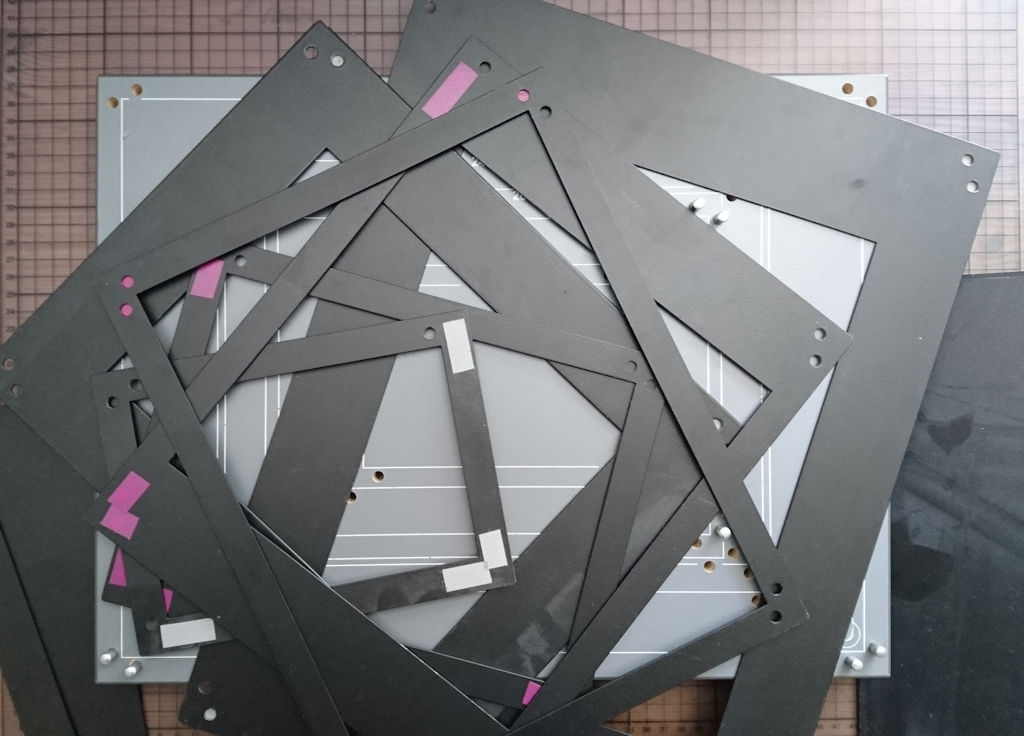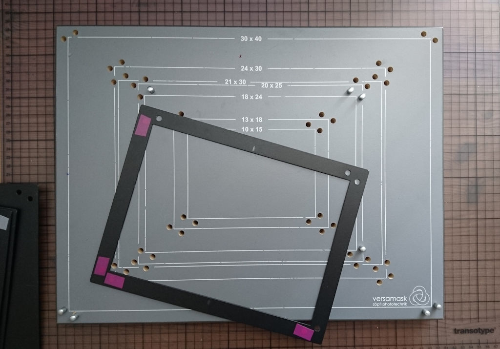 Dla formatów od 30x40 wzwyż zrobiłem maskownice (3szt) z płyty meblowej, zawiasów okiennych i profili aluminiowych. Do tego wyciąłem laserem z nierdzewki ramki pod papier 30x40, 40x50, 50x60, wszystko kwadrat i prostokąt. Zaletą sztywnych ramek jest fakt że zawsze trzymają kąty proste i wymiar co do milimetra (co jest ważne przy zamawianiu paspartów) i fakt że możesz przykładając ramkę do papieru równo odciąć z roli lub wyciąć kwadrat. W zasadzie mając taki szablon zrobisz to w ciemnościach. To rozwiązanie podejrzałem u Anity Andrzejewskiej, ona ma powycinane takie ramki z kartonów i trzymają papier nawet w kiepskich maskownicach.