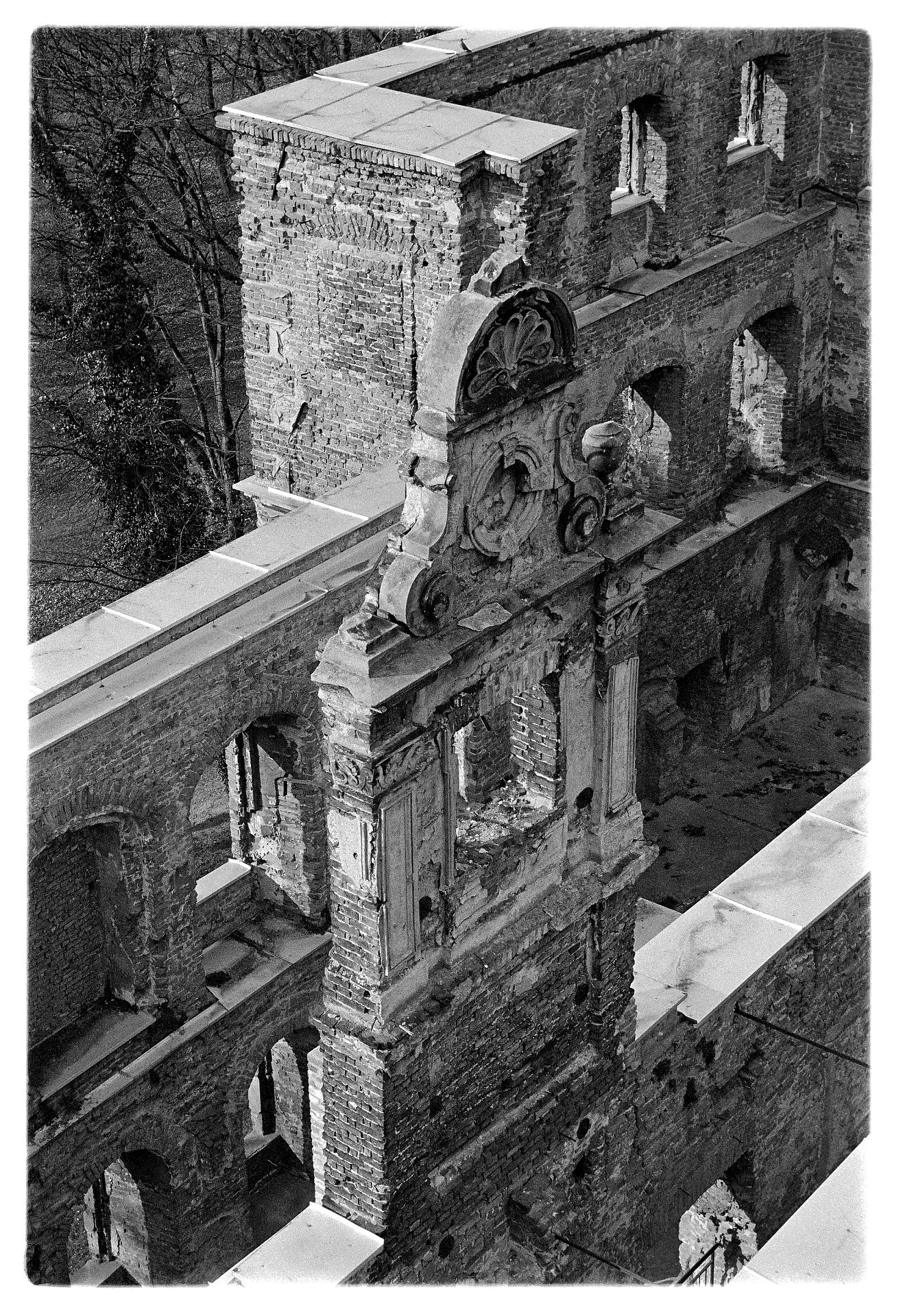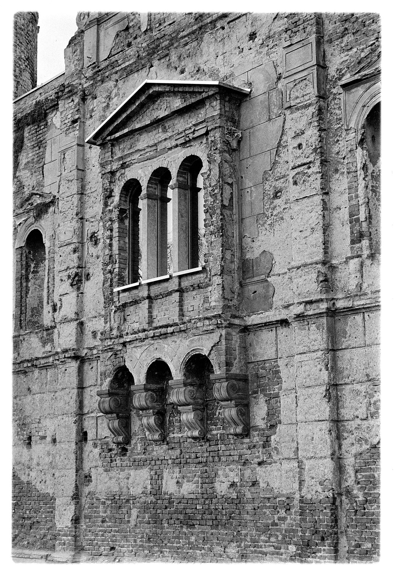 Stara średnia Agfa Isopan super special, znajoma wydobyła z aparatu nabytego na pchlim targu. Po ustaleniu że oryginalnie czasy wywoływania były podobne co dla Fp4, wyliczyłem że w stocku D-76 będzie 9 minut, po korekcie na temperaturę w moim mieszkaniu i +20% na szczęście, zrobiło się 14.5 minuty, postanowiłem dodać kroplę benzotriazolu i zaokrąglić do kwadransa. Negatyw wyszedł bardzo jednolicie zadymiony, niemal czarny, ale gdzieś w odmętach majaczą sylwetki ludzi i jakieś budynki.