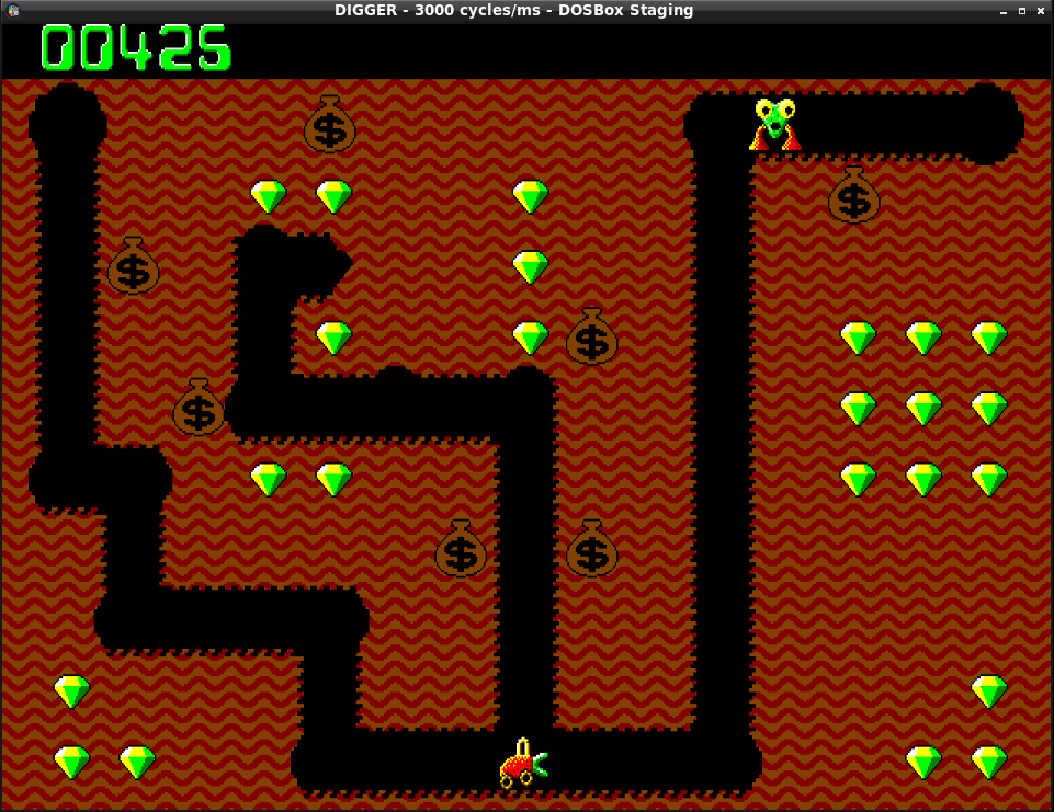 Digger... do dzisiaj wspominam jedyną sensowną grę na komputery :-) U mnie to się nazywało DigDug. Jest wersja javowa chyba, działa na obecnym sprzęcie, tylko w miarę przechodzenia na kolejne plansze robi się za szybko.