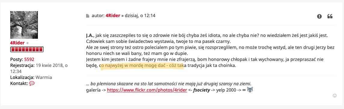 Człowiek honorowy który nie raz komuś ubliżył publicznie bez zdania racji, przeprasza, a nie grozi że w mordę da.