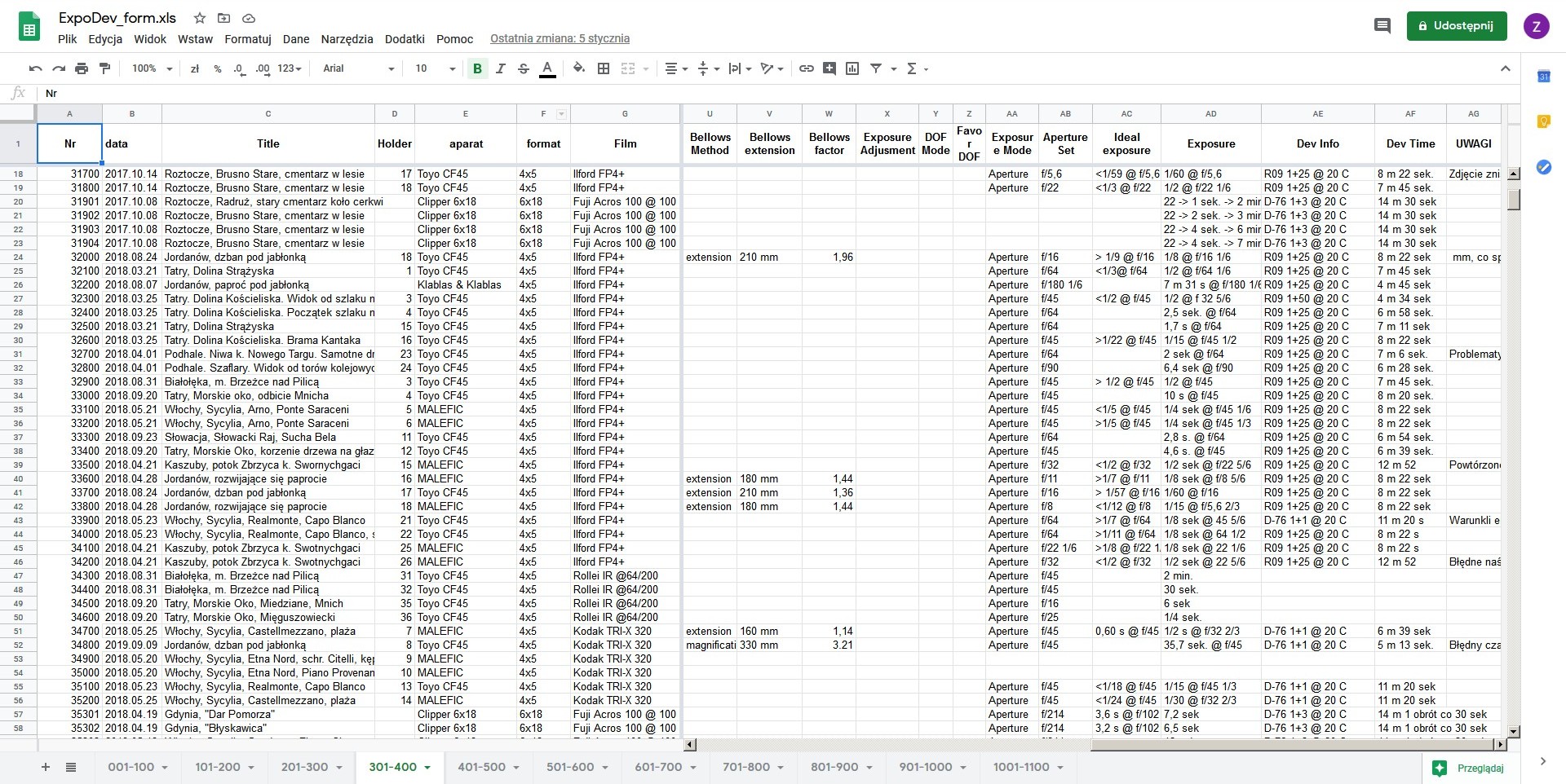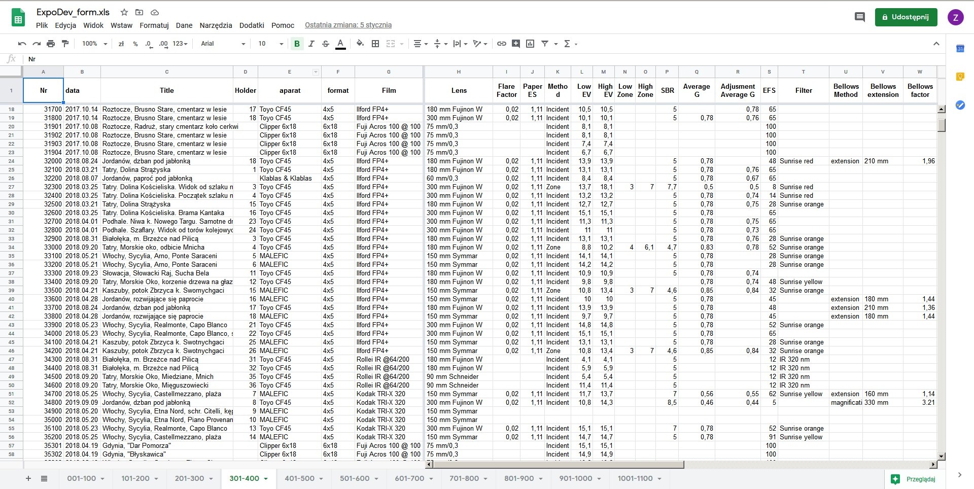 Poszedłem w katalog komputerowy. Używam excela - a dokładniej arkuszy googla - dane są dość rozbudowane, co wynika z tego, że przy naświetlaniu LF korzystam z aplikacji expoDev. Niestety, aplikacja nie ma możliwości eksportu danych, więc muszę je wpisywać ręcznie. Negatywy są fotografowane aparatem i odwracane+poziomy. Znajdują się w osobnych katalogach po 100. Niestety z baaardzo dużymi zaległościami.
