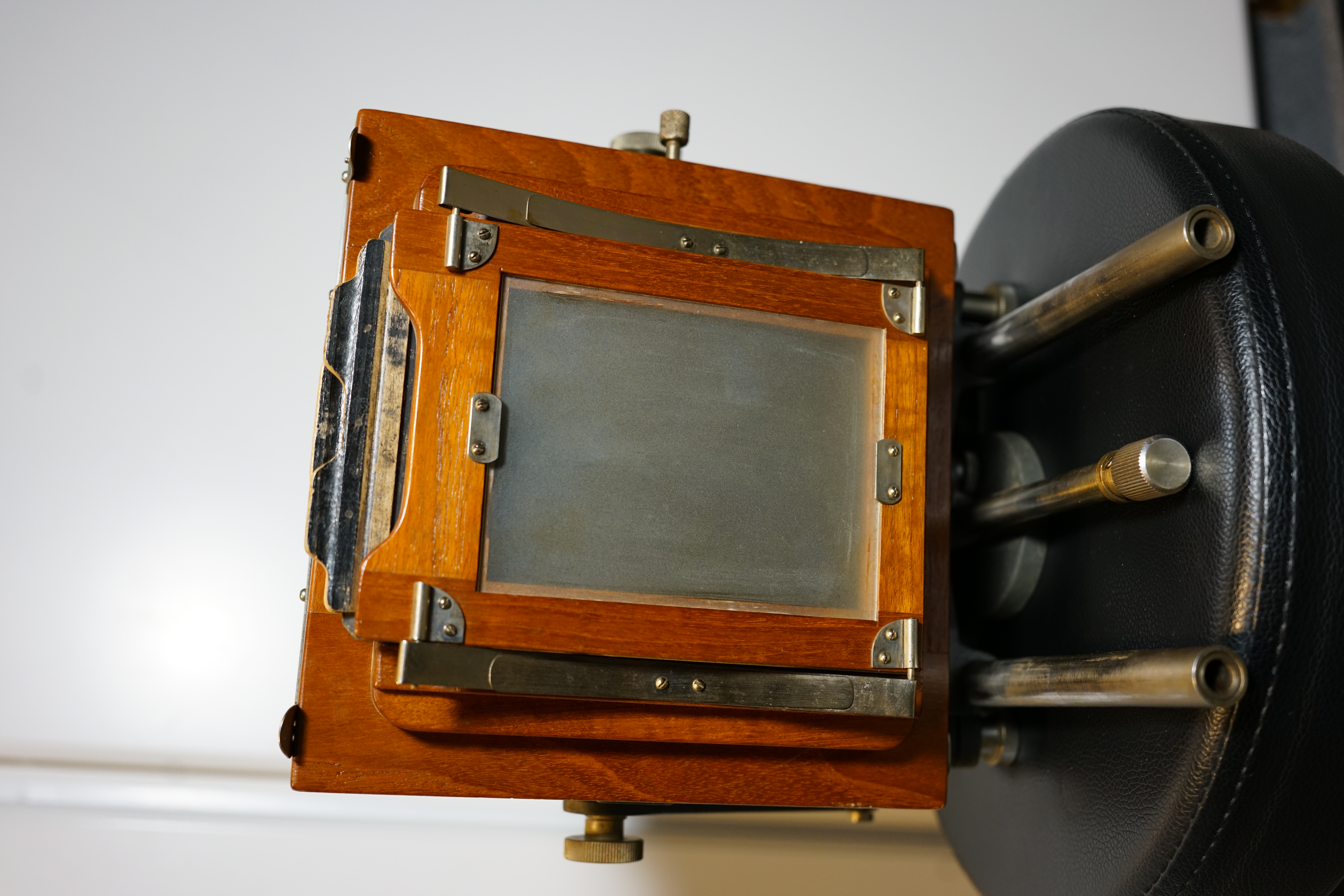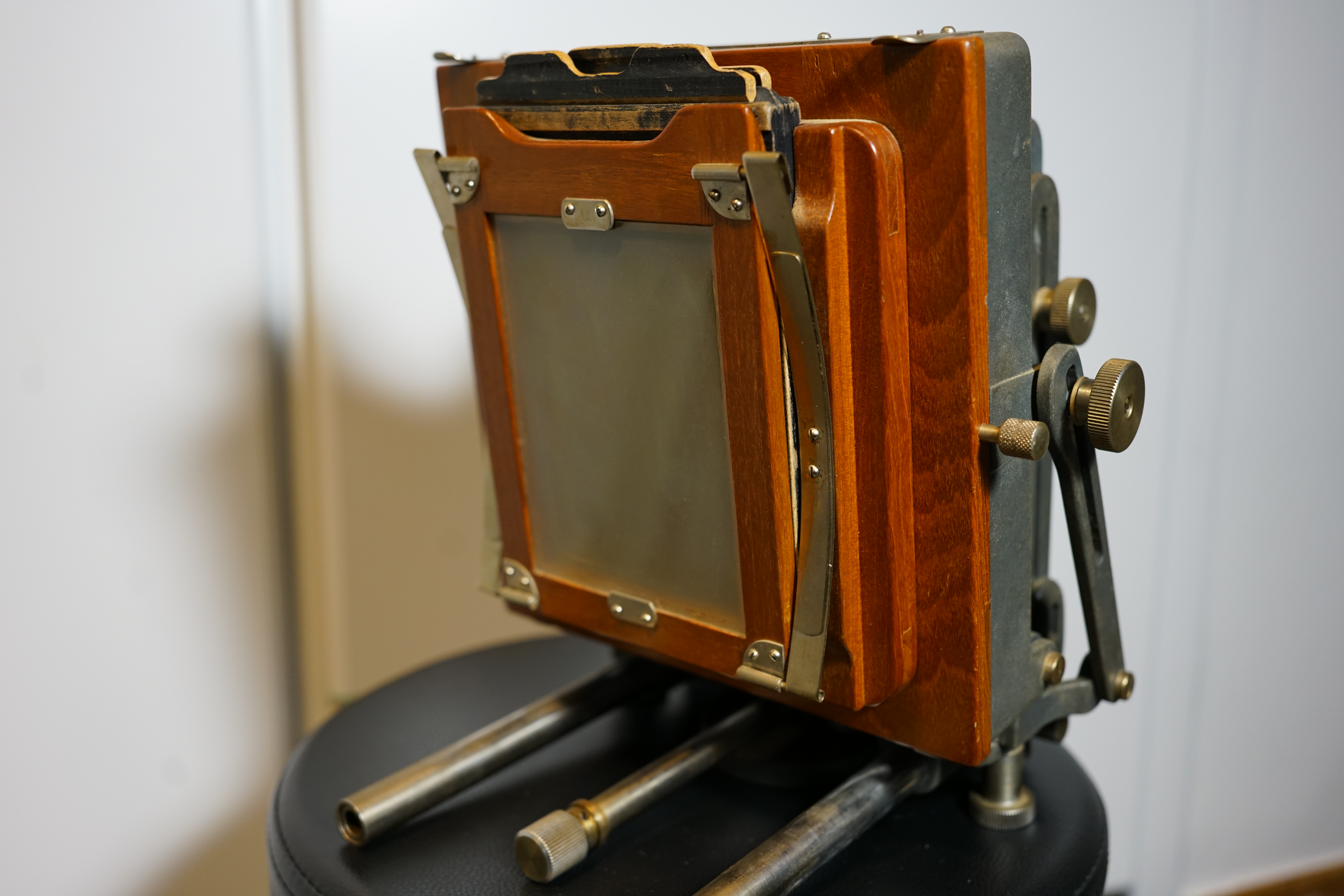 Sam aparat jest jak na mój gust duży, z jakiegoś lekkiego metalu, przedziwnej, moim zdaniem genialnej konstrukcji nie do zajechania. Pięknej jakości śruby, prowadnice, wsio chodzi jak szwajcarski zegarek, co mnie mile zaskoczyło. Miech ma dwa uszkodzenia, o czym wiedziałem wcześniej. Tyłek 9x 12 z jakiegoś bardzo fajnego drewna, ładnie wszystko spasowane. Obrotowy do portretu i krajobrazu. Drewniana kaseta podwójna, superfajnie dopasowana i w pięknym stanie. Na wyciągniętym miechu ma to jakieś 40 cm.